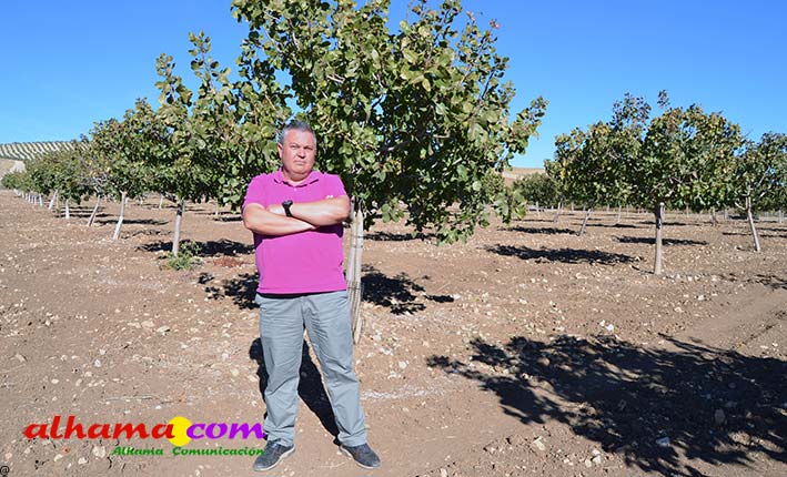 Hace siete años que el agricultor José Jiménez Valladares apostó por sembrar de pistacho once hectáreas de su finca de Alhama de Granada donde tenía tierra calma y cereal. Fue uno de los pioneros en introducir en su municipio un cultivo que le está dando alegrías y rentabilidad. Además de agricultor profesional, Jiménez Valladares es técnico agrícola con más de 25 años de experiencia y siempre le gusta ir por delante en su sector por lo que hizo sus cursos de formación en el IFAPA y se especializó en pistacho compartiendo experiencias con agricultores de La Mancha «que nos llevan 25 años de ventaja en este cultivo». «Me lo he trabajado mucho», admite. «Es un cultivo que me llama la atención y quería tener alternativas, para no cargar todo olivar y almendro. Tenemos el factor limitante del agua, ahora mismo ya tengo las aceitunas estresadas y el pistacho en cambio soporta bien la sequía».
