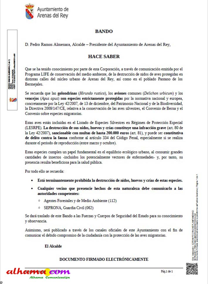Ayuntamiento de Arenas del Rey BANDO D. Pedro Ramos Almenara, Alcalde – Presidente del Ayuntamiento de Arenas del Rey, HACE SABER Que se ha tenido conocimiento por parte de esta Corporación, a través de comunicación emitida por el Programa LIFE de conservación del medio ambiente, de la destrucción de nidos de aves protegidas en distintas calles del núcleo urbano de Arenas del Rey, así como en el poblado Pantano de los Bermejales. Se recuerda que las golondrinas (Hirundo rustica), los aviones comunes (Delichon urbicum) y los vencejos (Apus apus) son especies estrictamente protegidas por la normativa nacional y europea, concretamente por la Ley 42/2007, de 13 de diciembre, del Patrimonio Natural y de la Biodiversidad, la Directiva 2009/147/CE, relativa a la conservación de las aves silvestres, el Convenio de Berna y el Convenio sobre especies migratorias. Estas aves están incluidas en el Listado de Especies Silvestres en Régimen de Protección Especial (LESRPE). La destrucción de sus nidos, huevos y crías constituye una infracción grave (art. 80 de la Ley 42/2007), sancionable con multas de hasta 200.000 euros (art. 81), y puede ser constitutiva de delito contra la fauna conforme al artículo 334 del Código Penal, especialmente si se realiza durante el periodo de reproducción (entre marzo y octubre). Estas especies cumplen un papel fundamental en el equilibrio ecológico urbano, al consumir grandes cantidades de insectos —incluidos los potencialmente vectores de enfermedades—, y, por tanto, su presencia resulta beneficiosa para la salud pública. Por todo ello se recuerda: Está terminantemente prohibida la destrucción de nidos, huevos y crías de estas especies. Se dará traslado de este Bando a las Fuerzas y Cuerpos de Seguridad del Estado para su conocimiento y observancia. Asimismo, será publicado a través de los canales oficiales de este Ayuntamiento con el fin de comunicar el debido compromiso de la ciudadanía con la protección de las aves migratorias. El Alcalde |