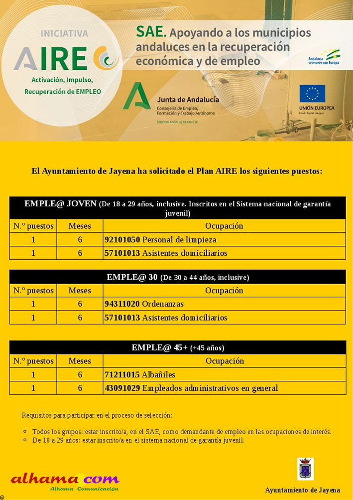 El Ayuntamiento de Jayena ha solicitado el Plan AIRE los siguientes puestos:Una de los requisitos imprescindibles en el tramo de edad de los 18 a 29 años es estar inscrito en el Sistema Nacional de Garantía Juvenil. En Jayena existen 157 vecinos censados entre 16 y 30 años. El indice de inscripción en la Comarca de Alhama en este sistema es muy bajo.