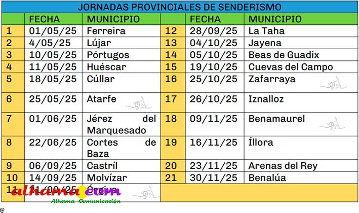 Las Jornadas Provinciales de Senderismo 2025 continuarán durante los meses de otoño con nuevas sedes. Tras Jayena, la siguientes citas tendrán lugar: Zafarraya (25 de octubre) e Iznalloz (26 de octubre). La temporada concluirá con las rutas previstas en Benamaurel (9 de noviembre), Íllora (16 de noviembre), Arenas del Rey (23 de noviembre) y Benalúa (30 de noviembre)