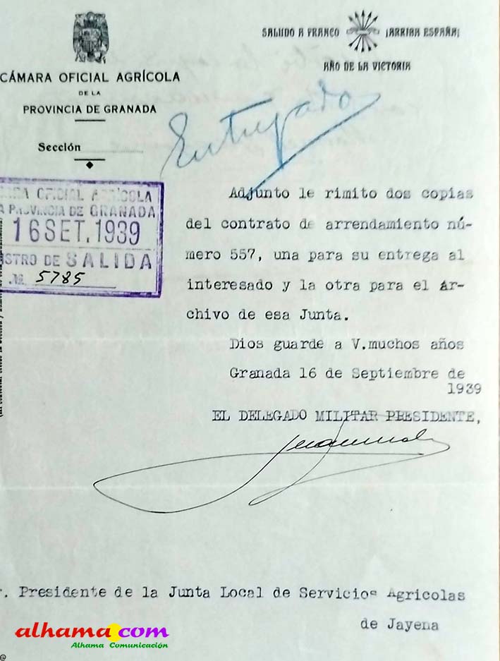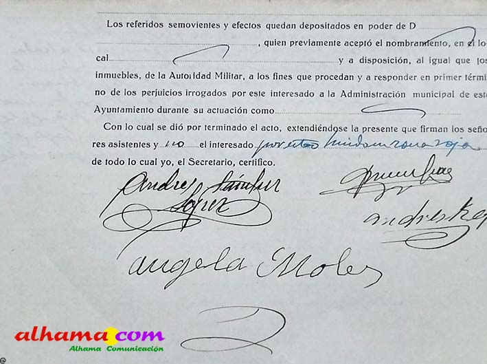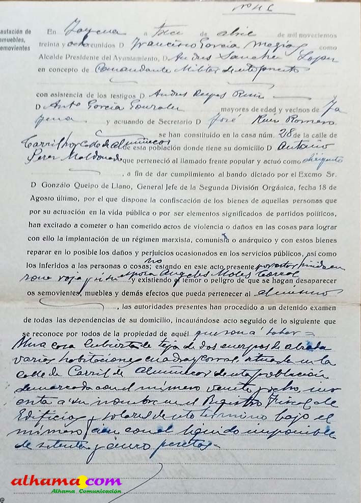 Era el 13 de abril de 1938 cuando se produjo la notificación. En dependencias municipales, y bajo la autoridad del alcalde, se le comunicó oficialmente la incautación de todos sus bienes inmuebles. El motivo alegado no dejaba lugar a dudas: ser esposa de quien había sido considerado dirigente del frente popular. Se encuentran presentes en esa trágica comunicación el mencionado alcalde y el comandante de puesto de la guardia civil de jayena (A.S.L.), con la presencia de dos testigos A.R.R. y A.G.G.; actuando de secretario J.R.R.