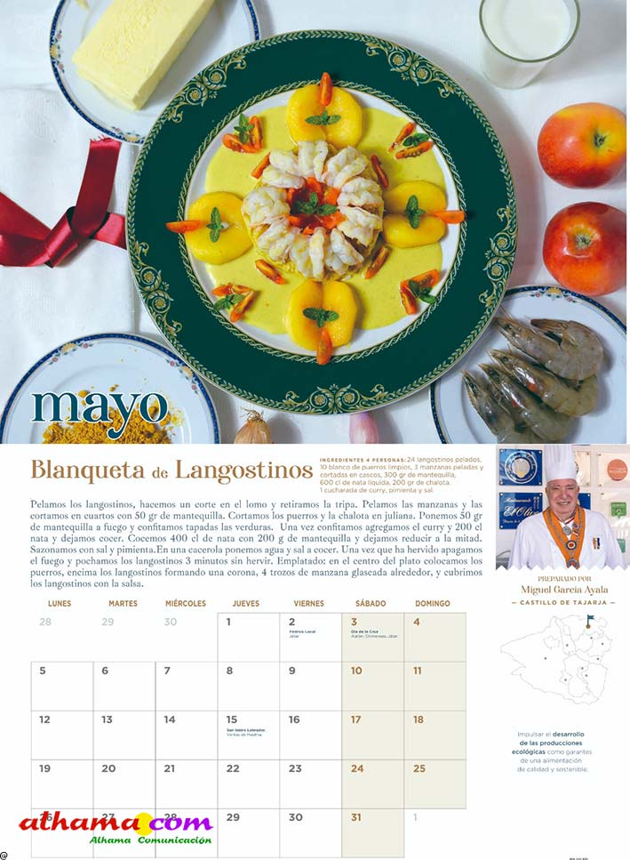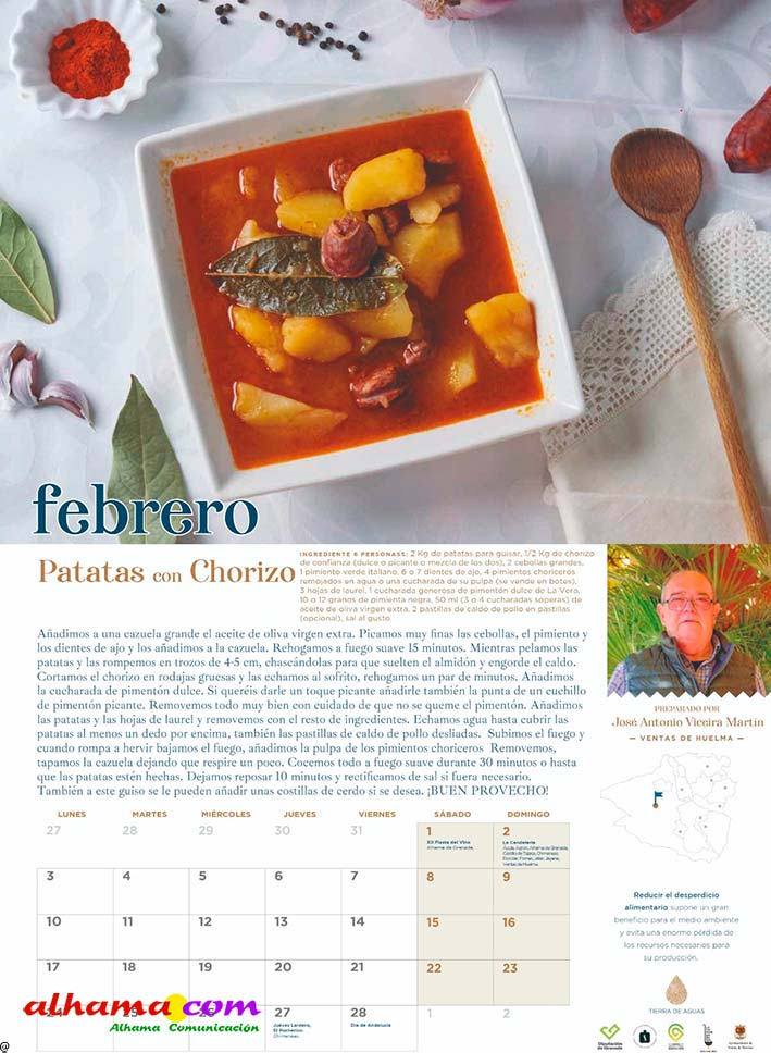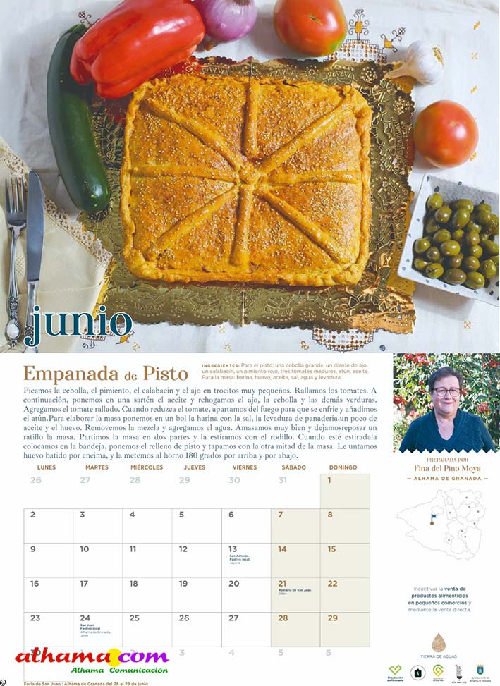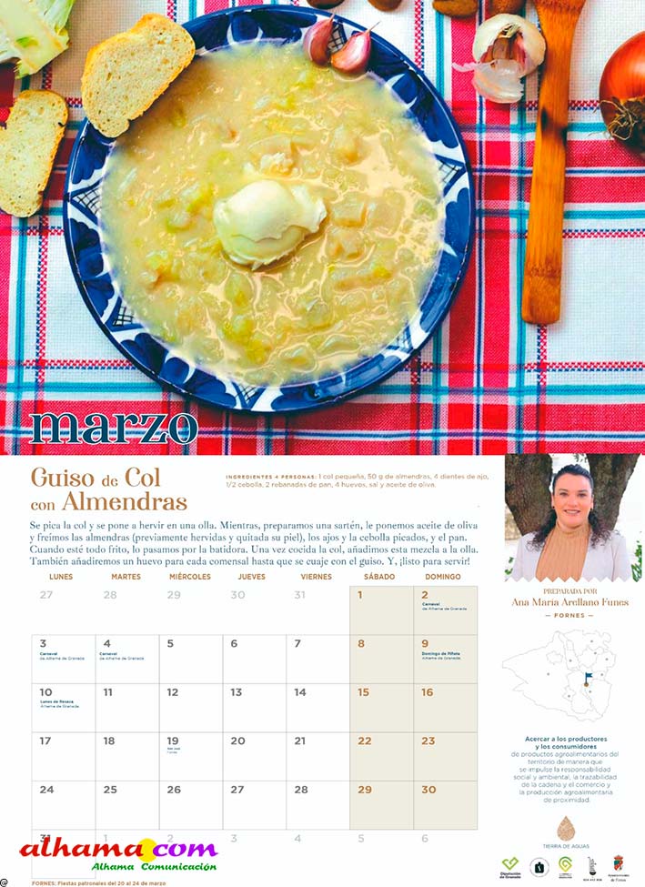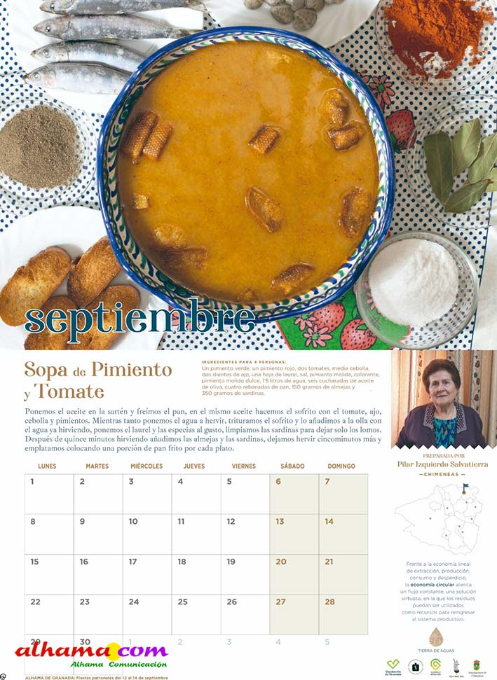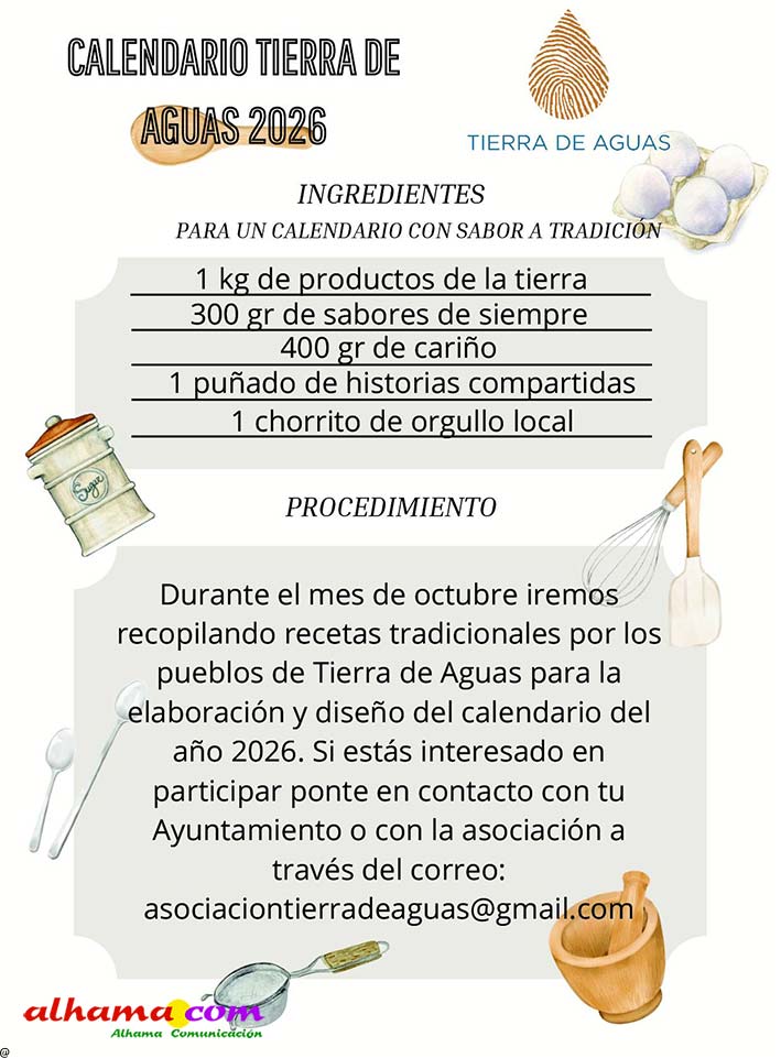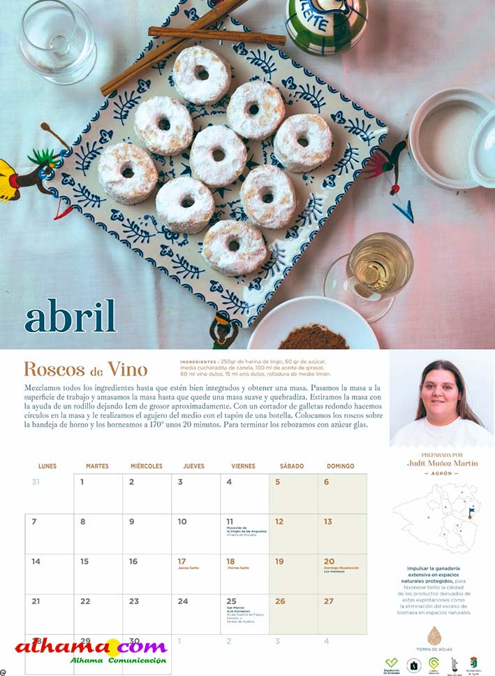 En 2023, la Asociación Tierras de Aguas que, en la actualidad aglutina ocho municipios de las comarcas de Alhama y El Temple: Agrón, Alhama, Chimeneas, Escúzar, Fornes, Játar, Jayena y Ventas de Huelma, puso en marcha la interesante iniciativa de publicar un calendario con recetas típicas de la zona, elaboradas con productos de la tierra por vecinos de ambas comarcas. Se procuraba que la receta estuviese en concordancia con la estación del año y de la que, una vecina, principalmente, y algún varón decidido, indicaban los ingredientes y proceso de elaboración. De esta forma se facilitaba la conservación de platos tradicionales como la sopa de maimones, las torrijas, el potaje de maimones, el potaje de morillas, la calabaza frita, los borrachuelos o las gachas de miel de caña. El año pasado se incluían otras doce recetas como la tarta de la abuela, el potaje de vigilia, la sopa de espárragos, los calostros, el ajo blanco, la mermelada de higos o el cocido de garbanzos, entre otros. En lo que va de 2025 las recetas incluidas en este práctico almanaque han sido la sopa de ajo, el guiso de col con chorizo, los roscos de vino, la empanada de pisto, la pipirrana, o el queso artesano de Alhama. Ya están buscando a las personas de ambas comarcas que quieran compartir alguna receta«con sabor a tradición» para el calendario 2026.