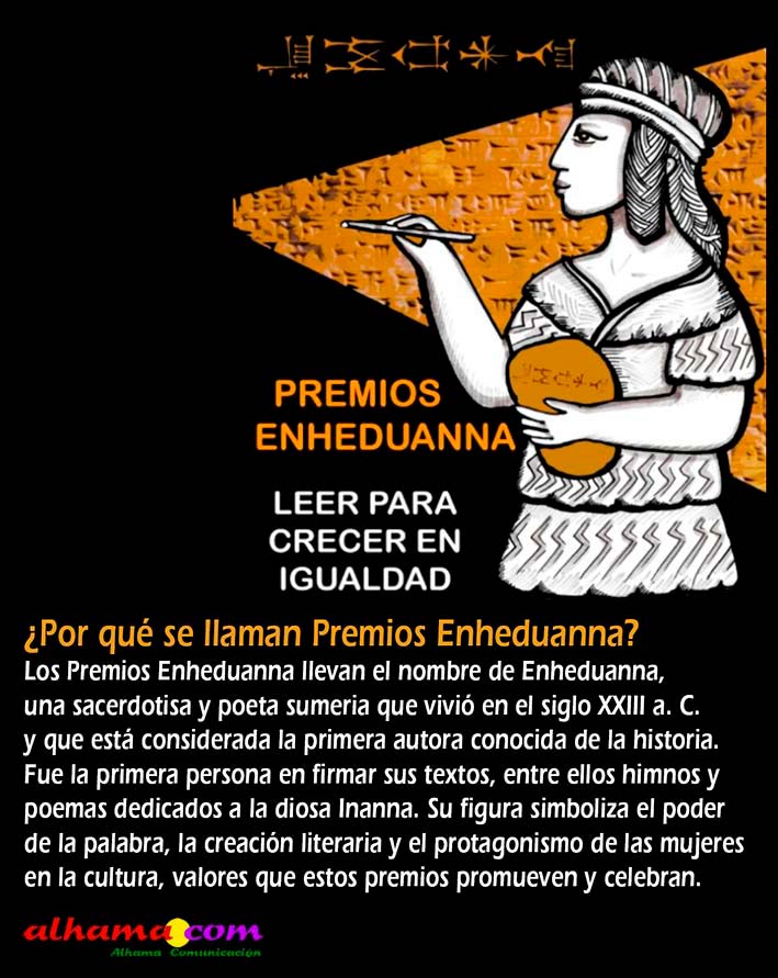 Los Premios Enheduanna llevan el nombre de Enheduanna, una sacerdotisa y poeta sumeria que vivió en el siglo XXIII a. C. y que está considerada la primera autora conocida de la historia. Fue la primera persona en firmar sus textos, entre ellos himnos y poemas dedicados a la diosa Inanna. Su figura simboliza el poder de la palabra, la creación literaria y el protagonismo de las mujeres en la cultura, valores que estos premios promueven y celebran.