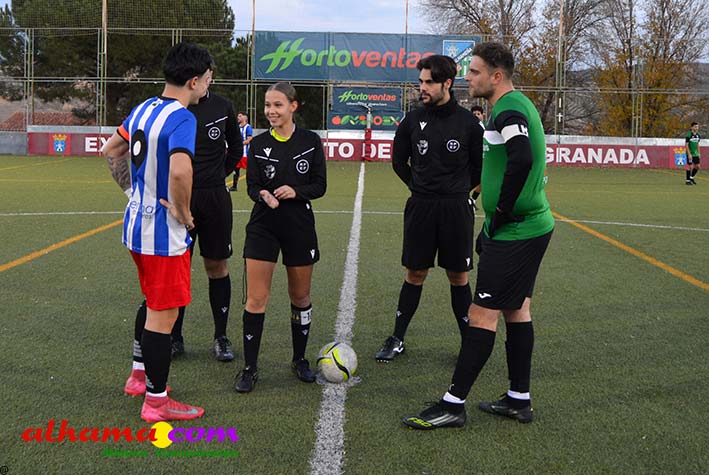 El conjunto local salió con la intensidad que merecía el encuentro y dispuso de ocasiones para adelantarse en el marcador pero sin embargo no fue hasta el minuto 16 cuando una gran jugada de Enrique fue culminada por él mismo para adelantar a los locales, aunque pocos minutos después Luismi pondría la igualada para los visitantes, tras un inicio frenético el partido se calmó hasta que en una jugada personal de Youssef fue culminado por Porri y adelantaba a los alhameños , con el resultado de 2 a 1en el marcador. En esta primera parte la UD Alhameña tuvo la mala suerte de tener dos bajas, la de Fran Molina por lesión en el isquiotibial y la de Alfredo Vega que dio el susto de la tarde tras un choque de cabeza con cabeza con un rival.