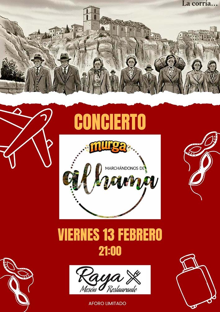 Así que ya lo saben: los días 15, 16, 17 y 22 de febrero, alhameños y visitantes quedan invitados a disfrutar de lo que posiblemente sea la agrupación más irreverente de nuestro Carnaval, aunque antes, el vienes 13 de febrero actuarán sobre las nueve de la noche en el Bar Raya para dar el pistoletazo de salida al carnaval, así que no le dudéis e ir a escuchar a esta murga porque luego quizás se marchen de Alhama.