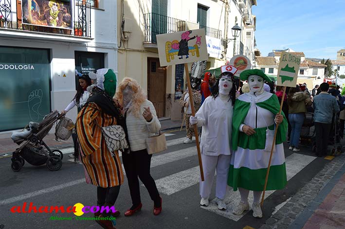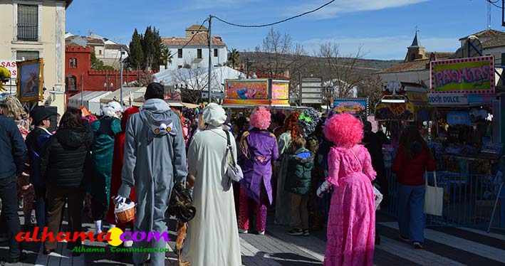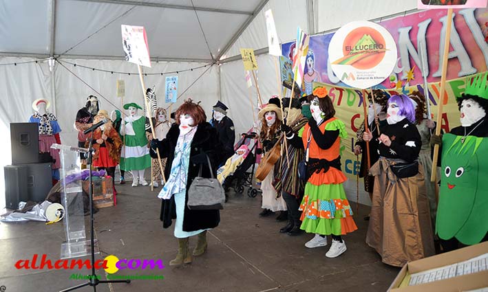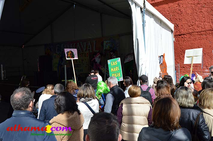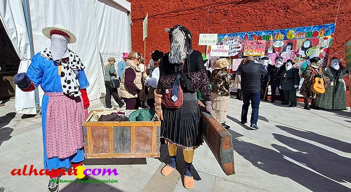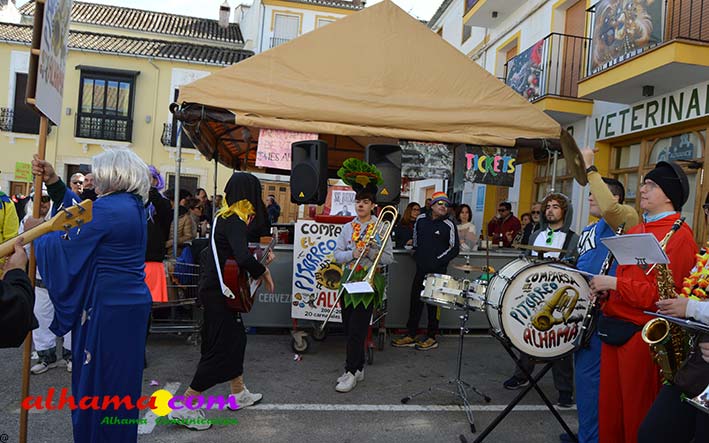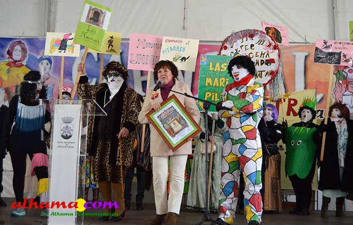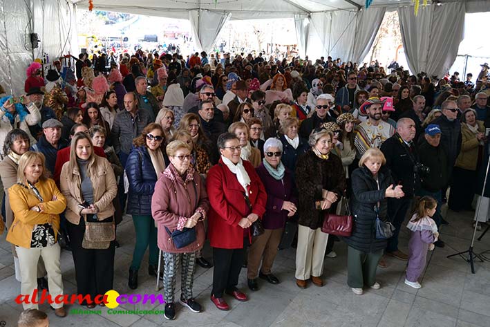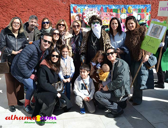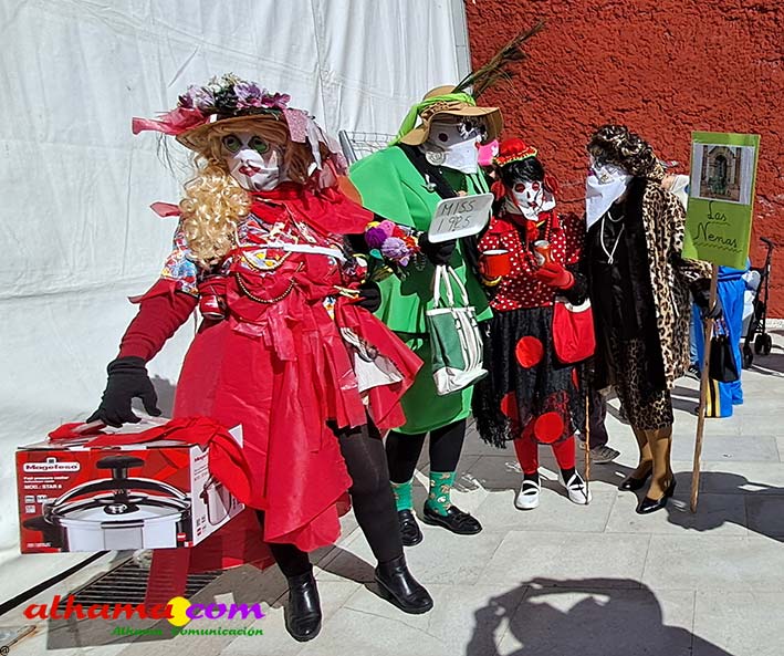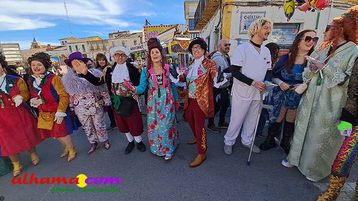 Por supuesto, también del Ayuntamiento que ha mantenido la programación habitual que se iniciaba en la mañana del domingo con un pasacalles carnavalero con las comparsas locales que transcurría por las principales calles de Alhama, al que siguió el pregón del Carnaval 2026 en la carpa municipal montada en el Paseo del Cisne qu en esta ocasión ha estado a cargo del Centro Permanente de Educación Alhucema que realizaron un completo recorrido por las principales agrupaciones a lo largo de los 46 años de carnavales democráticos en Alhama. Pregón que recibió las felicitaciones de la teniente de alcalde, Matilde Molina, así como de otros asistentes que valoraron la originalidad puesto que con una supuesta máquina de discos se hizo posible viajar en el tiempo al escuchar pequeños fragmentos de composiciones antiguas. Tras el mismo el carnaval se apoderó de la calle y tanto vecinos de Alhama como visitantes de los sitios más dispares disfrutaron de la gracia y picardía de las coplillas carnavaleras principalmente sobre temas locales y de las típicas máscaras jameñas y mascarones con la cara tapada.