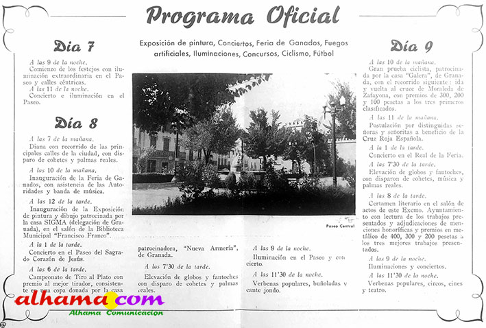 Al anochecer de aquél 7 de septiembre, una magnifica iluminación en el Paseo, como así se le denominaba a secas hasta en el mismo programa de fiestas, a excepción que bajo la foto central del mismo, se indicaba “Paseo Central” -ya estaba la fuente con el cisne pero sería en la segunda mitad de aquella década, concretamente con ocasión del cartel y noticias difundidas por todos los medios de Granada y Málaga del II Festival de la Canción de Alhama, cuando le denominaríamos Paseo del Cisne, en 1967-, así como en las que se relacionaban como calles céntricas, nos hizo sentir aún más profundamente que la feria se iba a iniciar, lo que respaldó aún más el primer concierto, a las once de la noche, de aquella feria de la Banda de Música en la que, por supuesto, entre sus primeras interpretaciones musicales estaba “La rancherita”, con aquellas imborrables estrofas de “Allá en el Rancho Grande, allá donde vivía...”, quizás la música más pegadiza de toda nuestra niñez y primeros años de juventud.