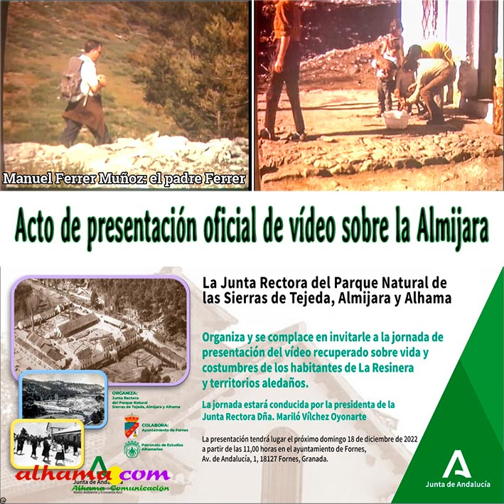 La Junta Rectora del Parque Natural Sierras de Tejeda, Almijara y Alhama a través de su presidenta, Mariló Vílchez Oyonarte, organiza el próximo domingo 18 de diciembre, en el Ayuntamiento de Fornes (Granada), la presentación oficial de ese vídeo.
