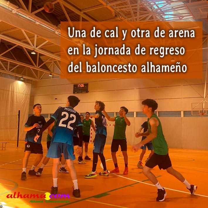 El baloncesto al contrario que el voleibol hubo suerte dispar. Los juveniles perdieron ante Huetor Vega, un rival que siempre se les atragantan, aunque la derrota deja el balance de victorias con derrotas equilibrado. El partido fue brusco por parte rival y donde el árbitro condicionó las defensas con el nivel aplicado a uno y otro equipo, tanto fue que el equipo alhameño le señaló tres técnicas.