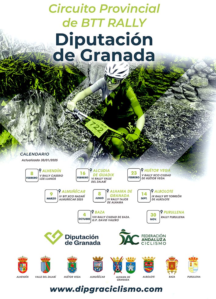 El diputado de Deportes e instalaciones Deportivas, Eric Escobedo, junto al presidente de la Federación Andaluza de Ciclismo, Carlos Rueda, ha presentado el Circuito Provincial de BTT Rally 2025. El evento contará con pruebas en los municipios de Alhendín, Alcudia de Guadix, Huétor Vega, Almuñécar, Alhama de Granada, Albolote, Baza y Purullena, y se celebrarán del 8 de febrero al 30 de noviembre. Abarcando diferentes categorías de ciclistas, desde Promesas hasta Máster 60, tiene el objetivo de promover el deporte en la provincia y ofrecer un espacio para que los deportistas granadinos muestren su talento.