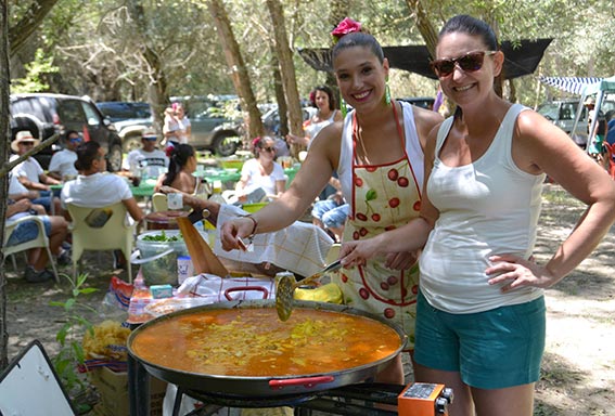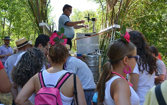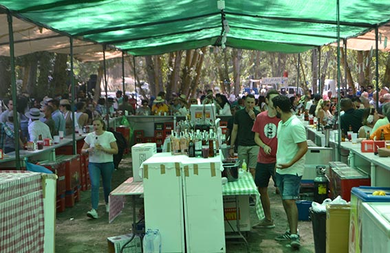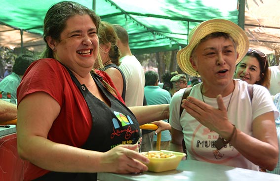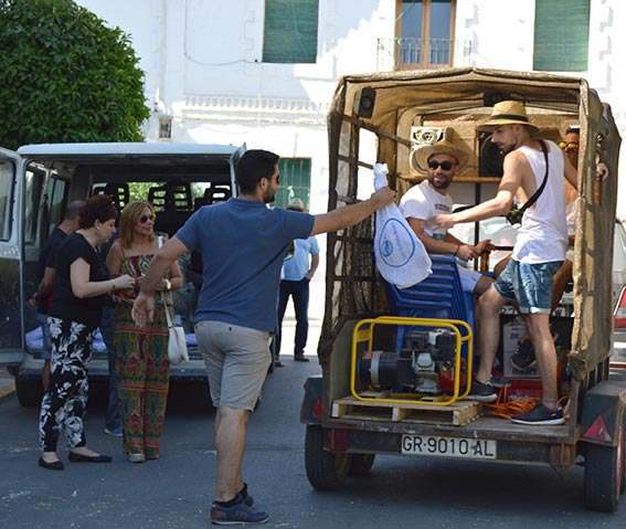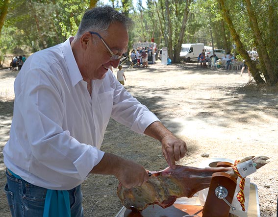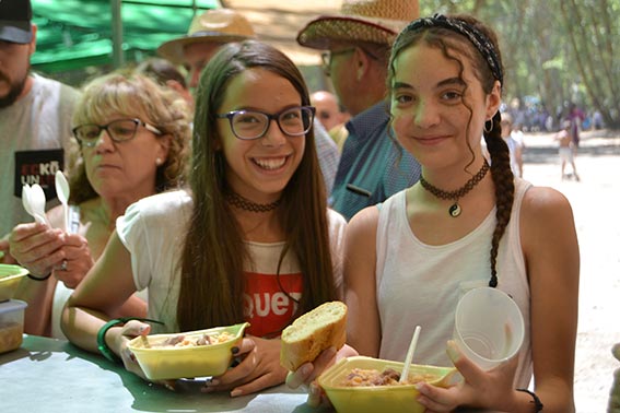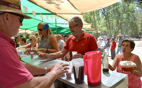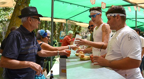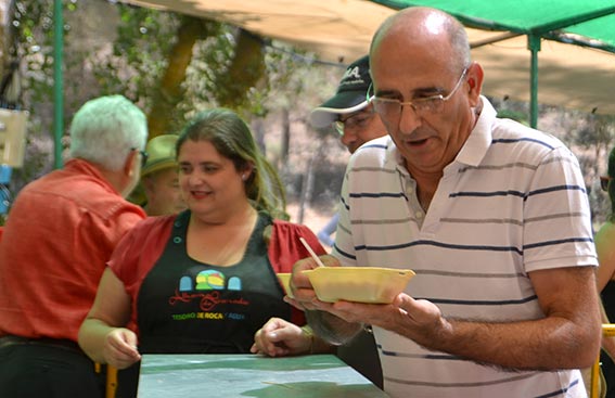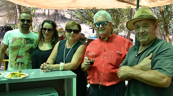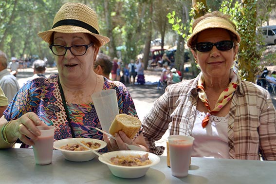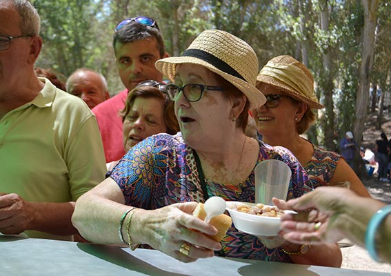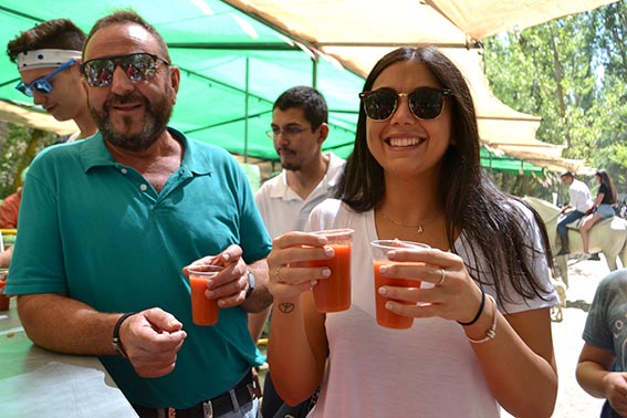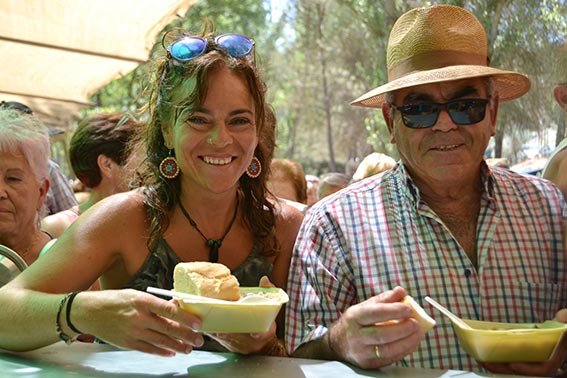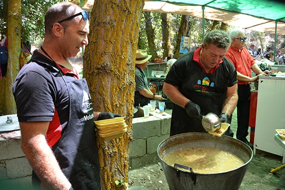 Y una vez en el Motor tocaba esperar que el plato típico alhameño, preparado por Manuel García ‘El Tanero’ estuviera a punto para ser degustado, junto con vino del terreno repartido por Maxi Mancebo y gazpacho andaluz, servido por Fernando López. Esto ocurriría a partir de las dos y media de la tarde. Manuel García nos contó que para las cuatro calderas de cocido había utilizado 75 kilogramos de garbanzos, donados por la Cooperativa Los Tajos, 22 kilogramos de higadilla y 25 kilogramos de corazones de cerdo, 28 kilogramos de gallina campera, 26 kilogramos de tocino y 2 de huesos añejos. Debido a que este año el número de visitantes esperado no se ha cumplido, después de repartir a todos, e incluso mucho repetir sobró al menos una caldera. También hubo posibilidad de repetir el gazpacho pues se prepararon para la ocasión 120 litros y tampoco hubo problema con el vino del terreno del lagar de la Tana pues la condición era continuar con su reparto en tanto hubiese 'olla jameña'.