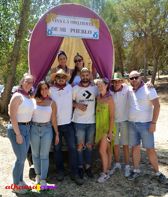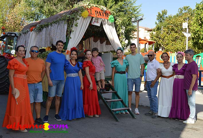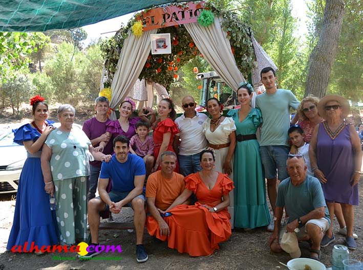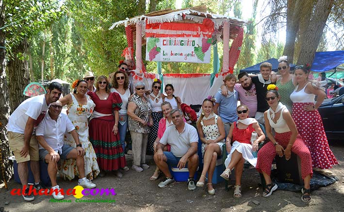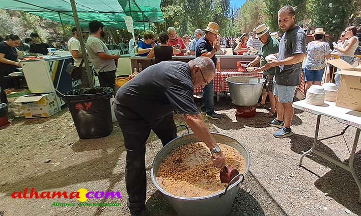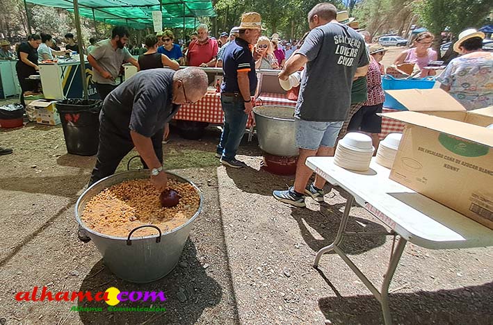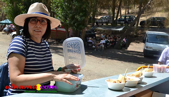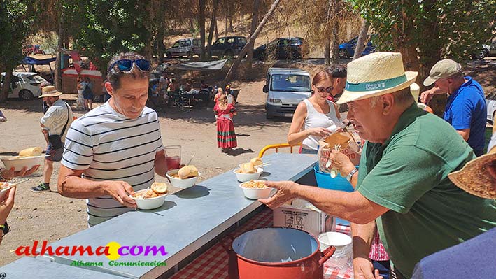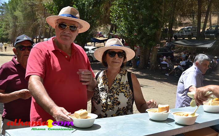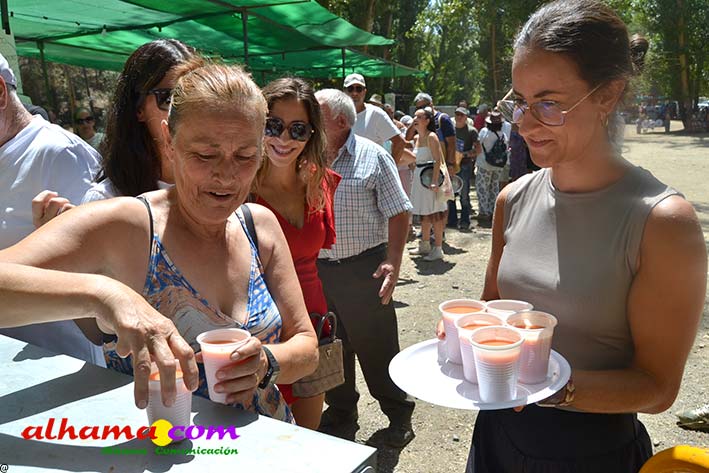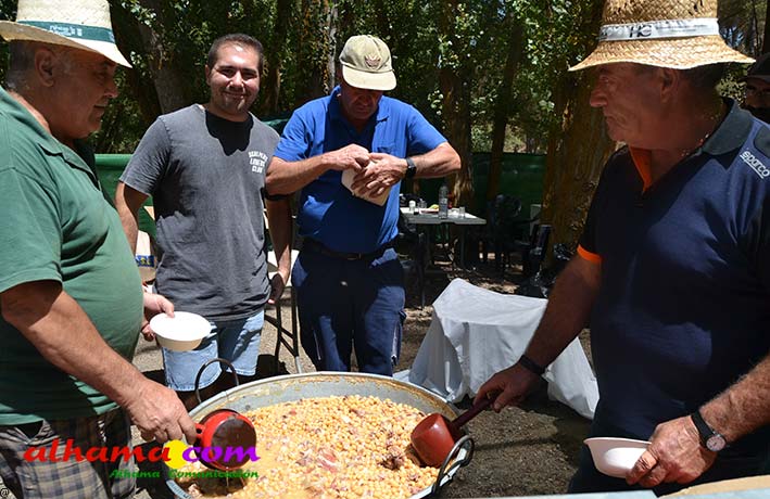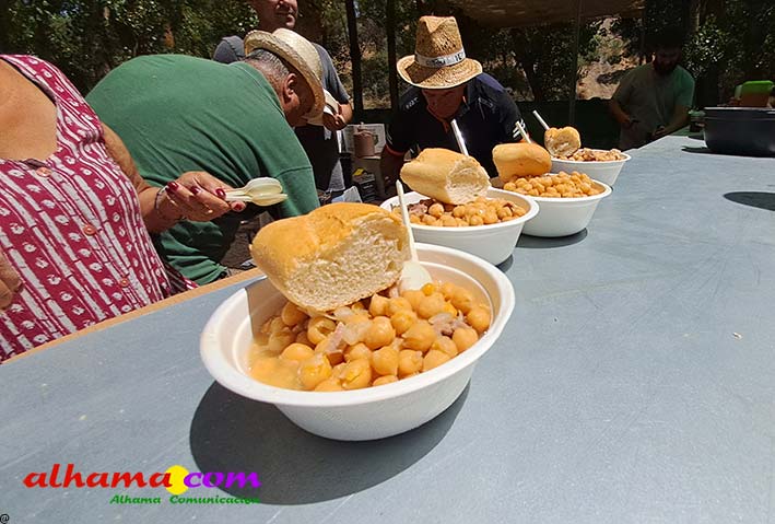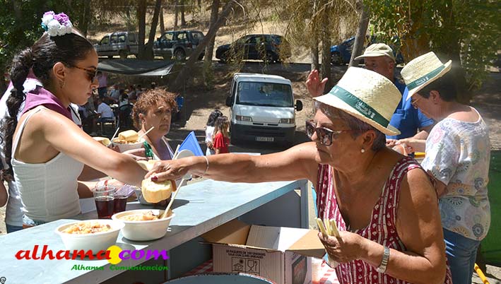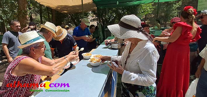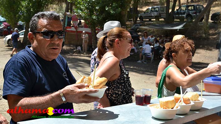 Ya en el paraje del Motor se congregaban todos los asistentes a esta fiesta y solo quedaba esperar el plato de olla que desde hace 14 años ediciones preparan Manolo García 'El Tanero' y su mujer, Toñi Sánchez, que nos contaban que para evitar cualquier riesgo de incendio la habían cocinada en su casa y transportado posteriomente al lugar donde se procedería a su reparto con la ayuda de varios operarios del ayuntamiento, Alcántara y Paco Camacho y el propio concejal de Juventud, Juan Calderón. También respondían a la pregunta de los ingredientes empleados, comenzando por 62 kilos de garbanzos, donados al Ayuntamiento por Cooperativa Los Tajos a los que añadieron 18 kg de gallina vieja, 16 kg higadilla de pollo, 20 kg de pancetas y 20 codillos de jamón. Este plato contundente, que el año pasado sobró pero este faltó, se repartía junto con pan, vino y gazpacho fresquito, en total hasta 120 litros de cada una de estas bebidas. Para el gazpacho es fundamental el tomate cedido por Hortoventas, «pues es el mejor para su preparación». En cuanto al vino de la Tana, único vino alhameño en la actualidad con su número de registro sanitario, ha conseguido este año una merecida medalla de oro en un certamen al que concurrían más de cien vinos de toda Andalucía. Ya por la tarde tendría lugar la tradicional carrera de cintas a caballo y la actuación musical, primero del grupo 'Canela en rama' y después de 'Dj Nacho'. Con antelación se llevó a cabo la entrega de premios a las carrozas recayendo el primer premio, consistente en un vale de comida para todos los miembros de la carroza por un importe de 350 euros, a los integrantes de 'El Patio'; el segundo, de un vale de 200 euros para 'Viva la orquesta de mi pueblo', y el tercero para 'Las Flamencas', que recibieron una cesta de productos valorada en 100 euros: ,