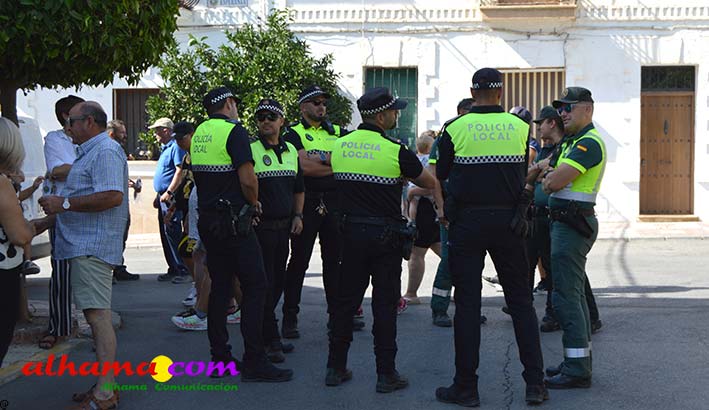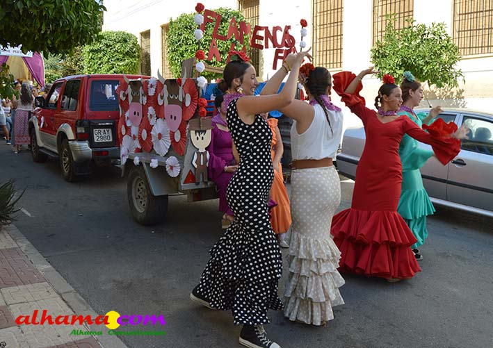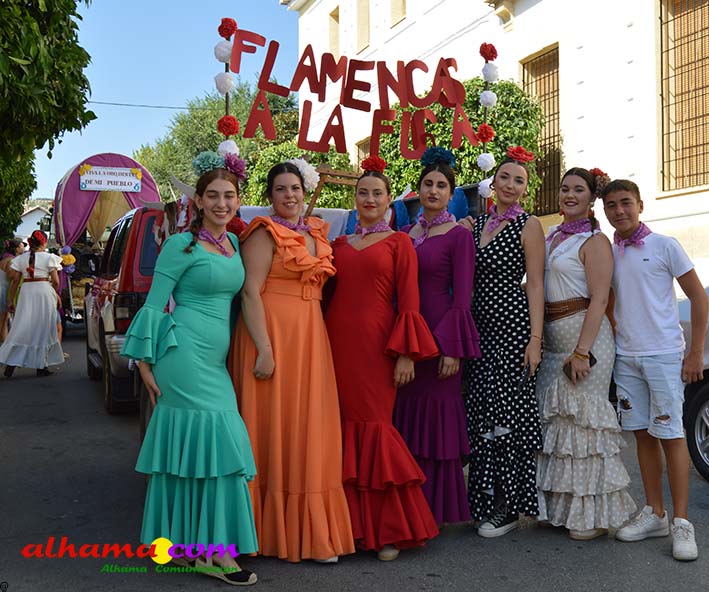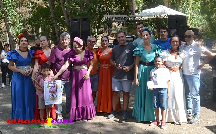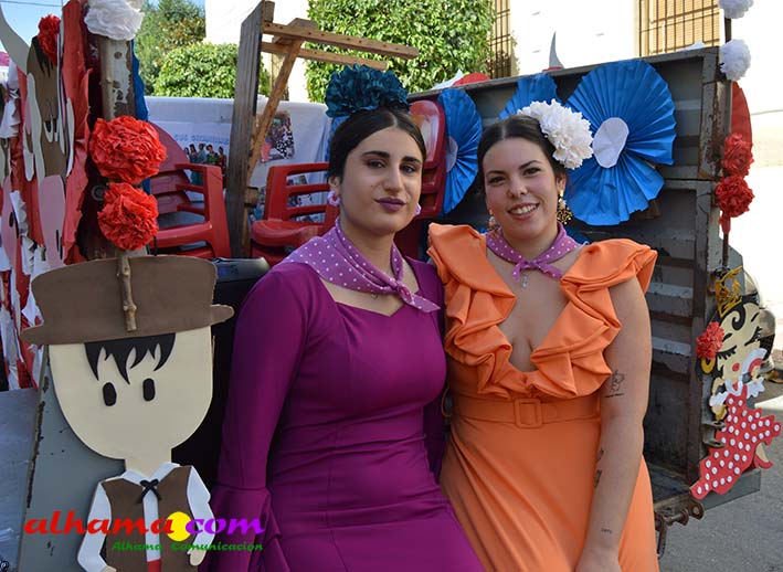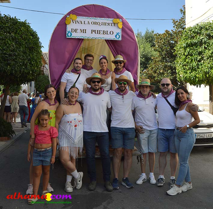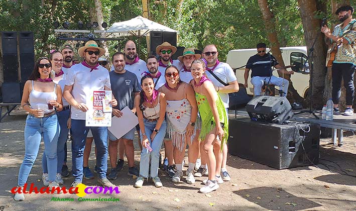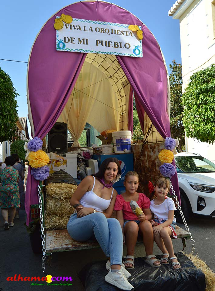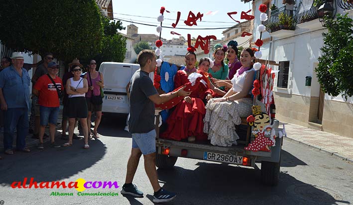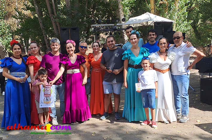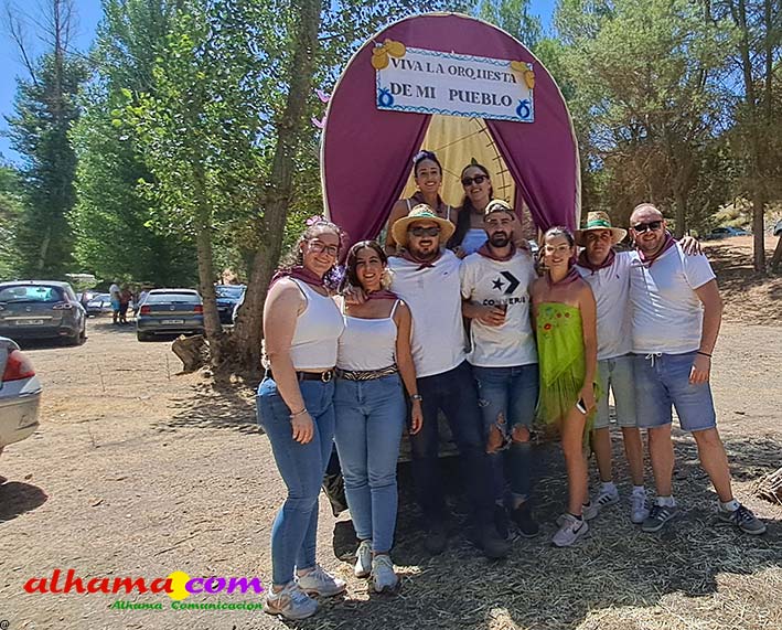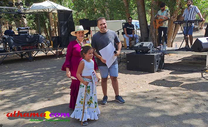 Ya en el paraje del Motor se congregaban todos los asistentes a esta fiesta y solo quedaba esperar el plato de olla que desde hace 14 años ediciones preparan Manolo García 'El Tanero' y su mujer, Toñi Sánchez, que nos contaban que para evitar cualquier riesgo de incendio la habían cocinada en su casa y transportado posteriomente al lugar donde se procedería a su reparto con la ayuda de varios operarios del ayuntamiento, Alcántara y Paco Camacho y el propio concejal de Juventud, Juan Calderón. También respondían a la pregunta de los ingredientes empleados, comenzando por 62 kilos de garbanzos, donados al Ayuntamiento por Cooperativa Los Tajos a los que añadieron 18 kg de gallina vieja, 16 kg higadilla de pollo, 20 kg de pancetas y 20 codillos de jamón. Este plato contundente, que el año pasado sobró pero este faltó, se repartía junto con pan, vino y gazpacho fresquito, en total hasta 120 litros de cada una de estas bebidas. Para el gazpacho es fundamental el tomate cedido por Hortoventas, «pues es el mejor para su preparación». En cuanto al vino de la Tana, único vino alhameño en la actualidad con su número de registro sanitario, ha conseguido este año una merecida medalla de oro en un certamen al que concurrían más de cien vinos de toda Andalucía. Ya por la tarde tendría lugar la tradicional carrera de cintas a caballo y la actuación musical, primero del grupo 'Canela en rama' y después de 'Dj Nacho'. Con antelación se llevó a cabo la entrega de premios a las carrozas recayendo el primer premio, consistente en un vale de comida para todos los miembros de la carroza por un importe de 350 euros, a los integrantes de 'El Patio'; el segundo, de un vale de 200 euros para 'Viva la orquesta de mi pueblo', y el tercero para 'Las Flamencas', que recibieron una cesta de productos valorada en 100 euros: ,