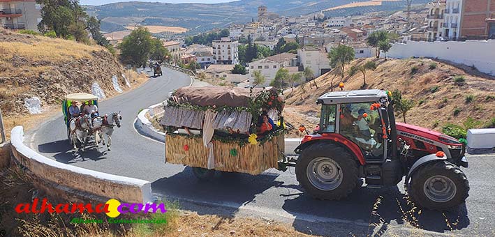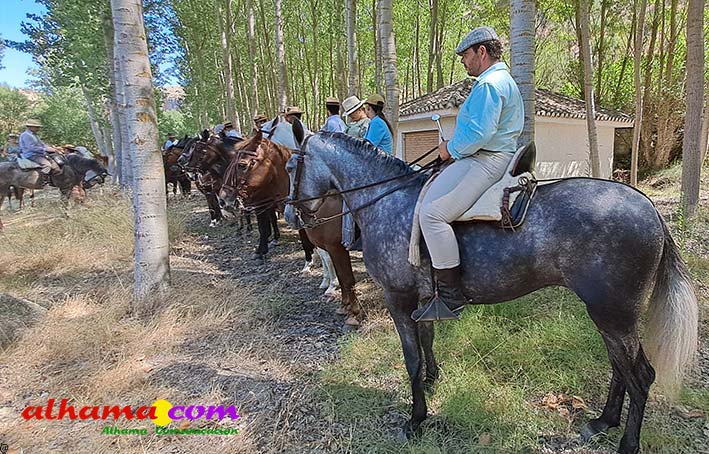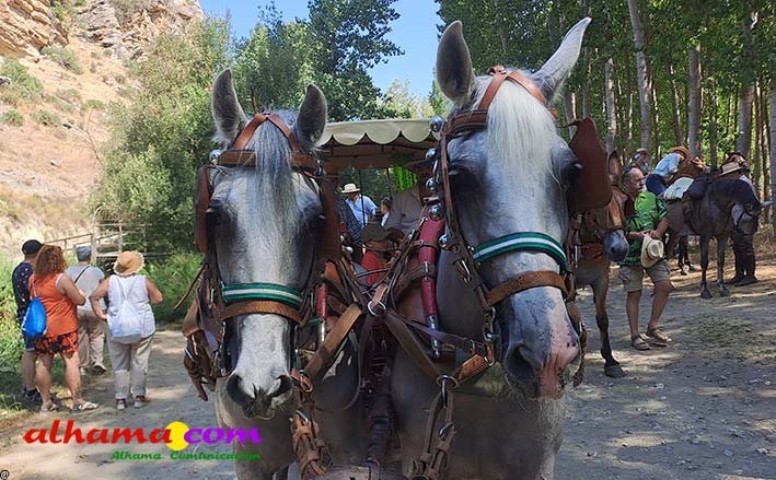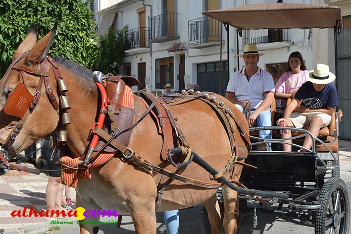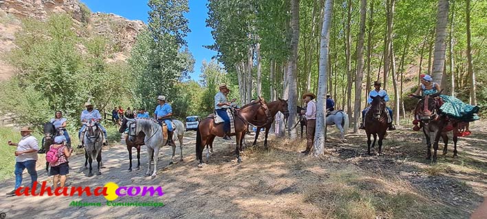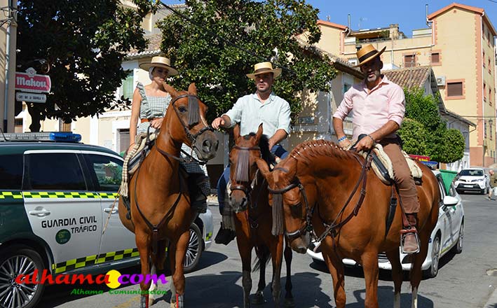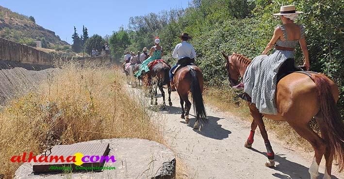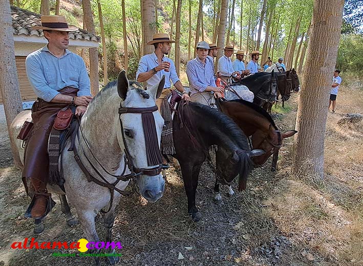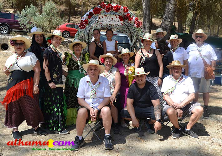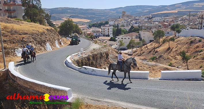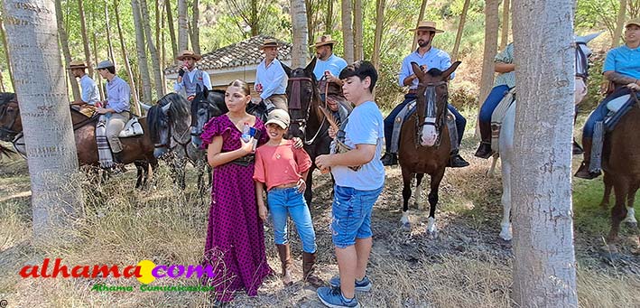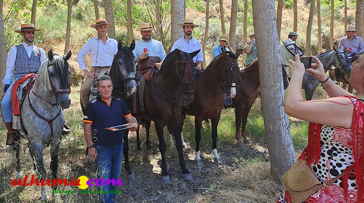 La Romería del Vino de Alhama de Granada arrancaba, un año más en la Plaza del Rey, con la celebración de la misa y la concentración de las cinco carrozas que en esta edición han participado y que hace añorar aquellos años en los que se superó la treintena y en las que, cada una, como mínimo contaba, con 15 integrantes. En cualquier caso, los participantes, muchos venidos de otras provincias pues el ayuntamiento hace coincidir esta celebración con el Día del Emigrante y forasteros que no quieren perderse esta peculiar celebración en la que se reparte gratuitamente tanto la olla jameña, como el gazpacho y el vino del terreno. Pasadas las once de la mañana, las carrozas emprendieron el camino por la carretera hacia el paraje del Motor, en tanto que los caballistas lo harían por el Camino de los Ángeles, este año sin la yunta de bueyes acompañada del tamboril que mucha gente ha echado de menos por la bella estampa que creada su paso y parada en la ermita de los Ángeles. También porque les permitía caminar a un paso más tranquilo. Afortunadamente, tal y como estaba previsto, se realizó una parada en el entorno del chiringuito donde se ofreció un refrigerio a los caballistas y acompañantes.