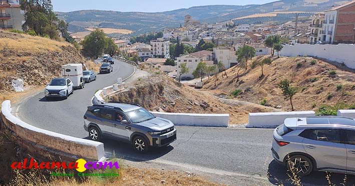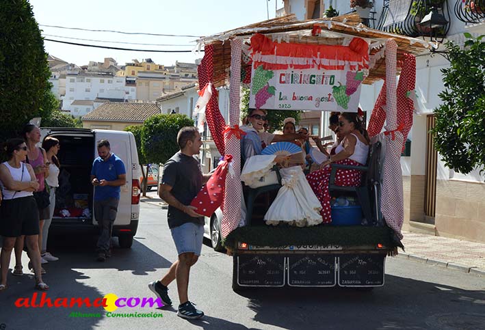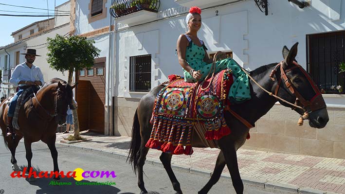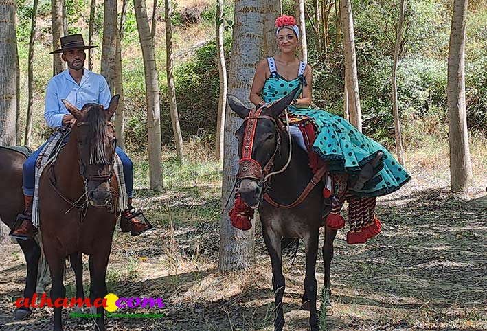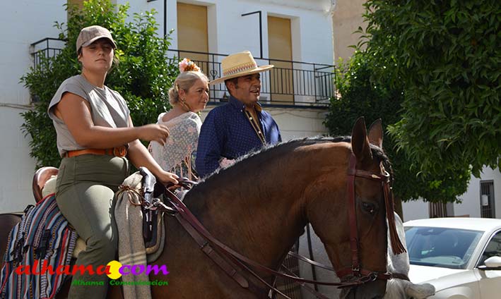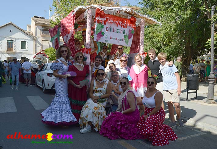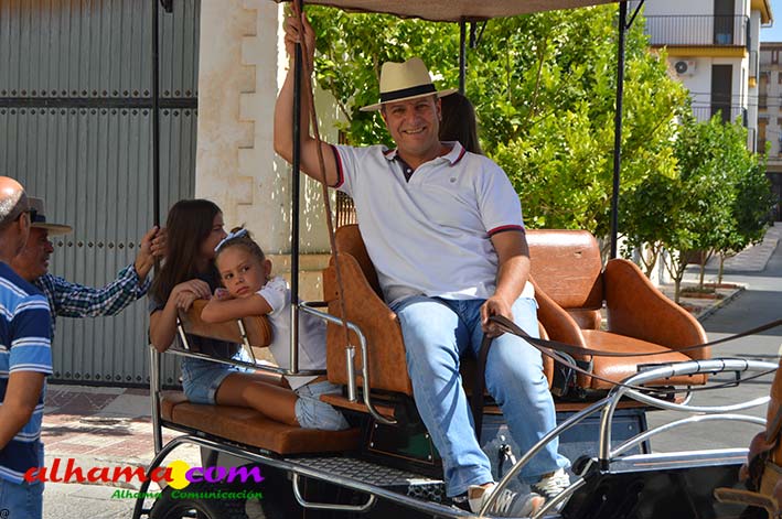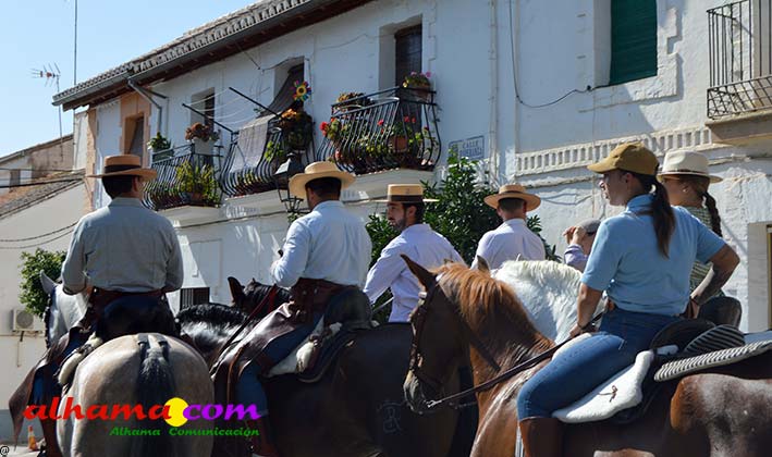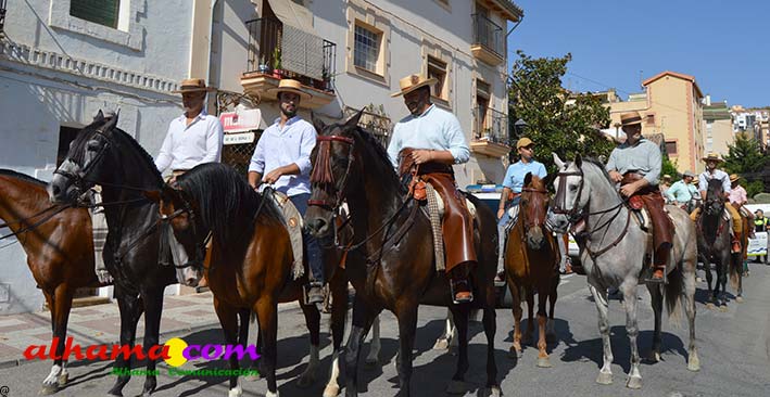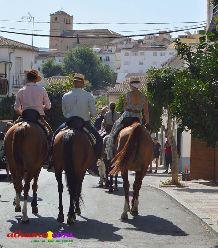 La Romería del Vino de Alhama de Granada arrancaba, un año más en la Plaza del Rey, con la celebración de la misa y la concentración de las cinco carrozas que en esta edición han participado y que hace añorar aquellos años en los que se superó la treintena y en las que, cada una, como mínimo contaba, con 15 integrantes. En cualquier caso, los participantes, muchos venidos de otras provincias pues el ayuntamiento hace coincidir esta celebración con el Día del Emigrante y forasteros que no quieren perderse esta peculiar celebración en la que se reparte gratuitamente tanto la olla jameña, como el gazpacho y el vino del terreno. Pasadas las once de la mañana, las carrozas emprendieron el camino por la carretera hacia el paraje del Motor, en tanto que los caballistas lo harían por el Camino de los Ángeles, este año sin la yunta de bueyes acompañada del tamboril que mucha gente ha echado de menos por la bella estampa que creada su paso y parada en la ermita de los Ángeles. También porque les permitía caminar a un paso más tranquilo. Afortunadamente, tal y como estaba previsto, se realizó una parada en el entorno del chiringuito donde se ofreció un refrigerio a los caballistas y acompañantes.