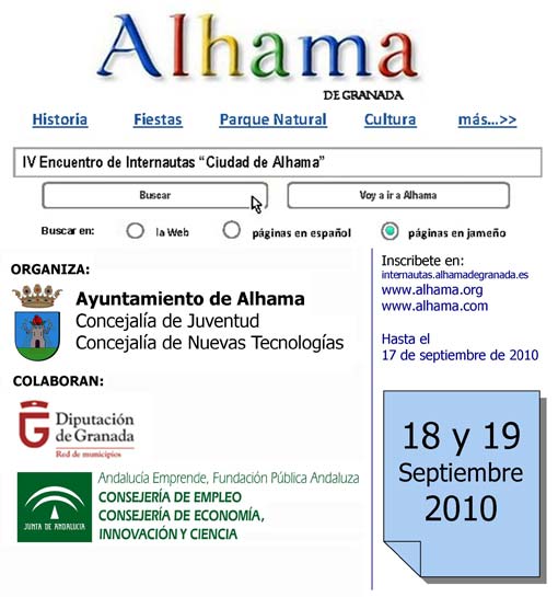 El 'Encuentro de Internautas Ciudad de Alhama' llega a su cuarta eidición, y se celebrará los días 18 y 19 de septiembre. Lainuguración será el sábado a las 10 de la mañana, y la clausura el domingo a las 5:30 de la tarde, con la entrega de premios de esta edición.