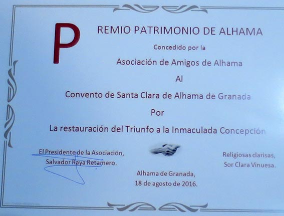 Alhama recupera, de manos de las Hermanas Clarisas del convento de San Diego de Alhama de Granada, una columna donde se erige una imagen de la Inmaculada Concepción que data de 1728 y que desapareció aproximadamente sobre el año 1849, así como todo el espacio que la rodea, conocido como “El compás” justamente al lado de la entrada al convento, y que en otro tiempo fuera todo diáfano.