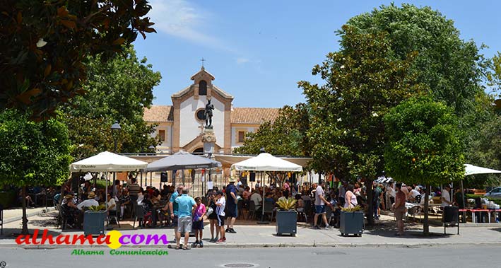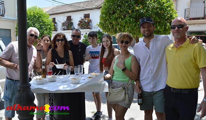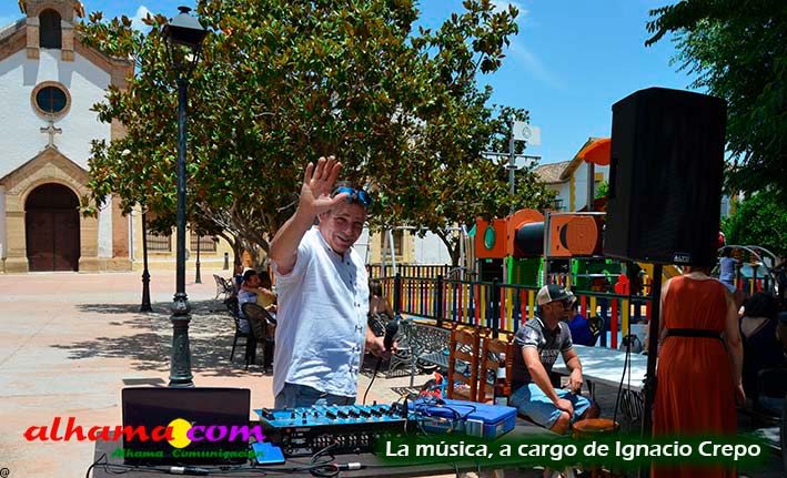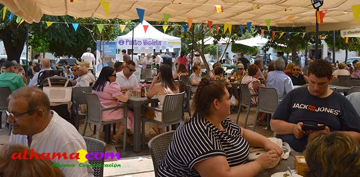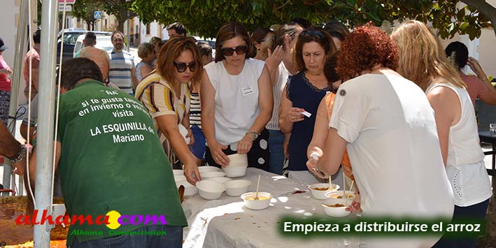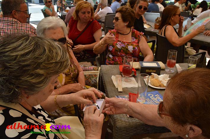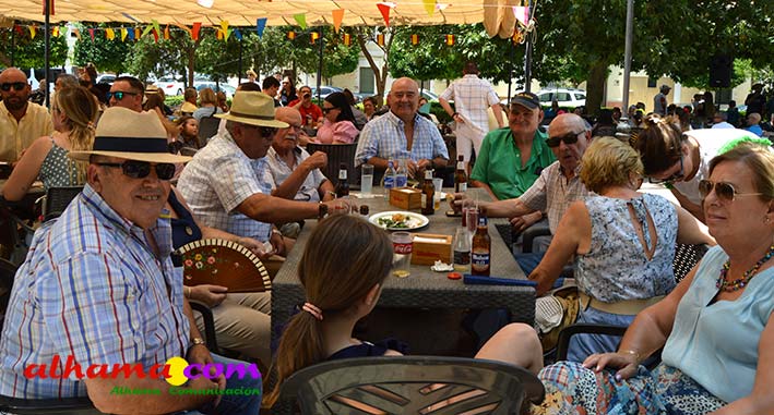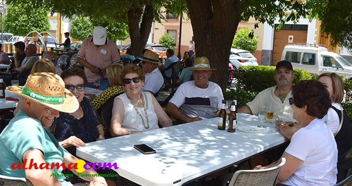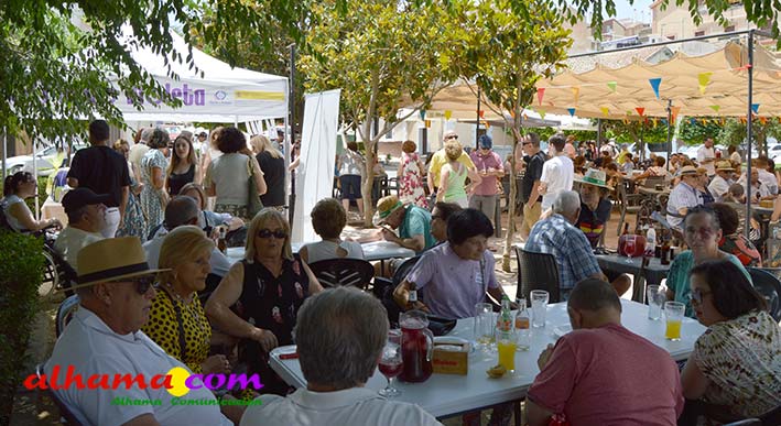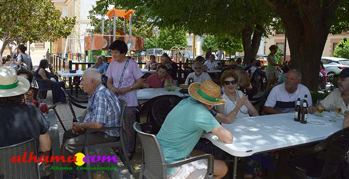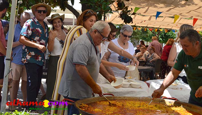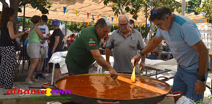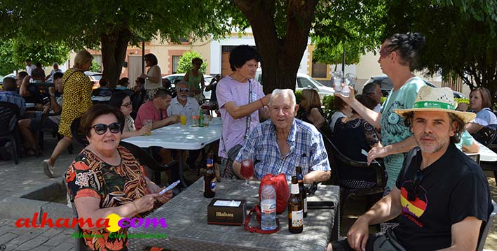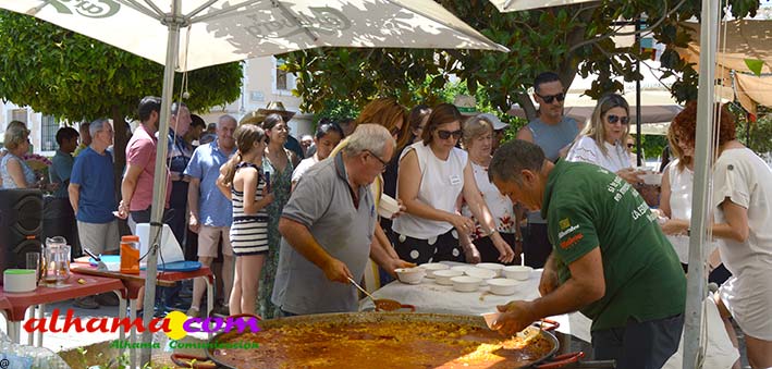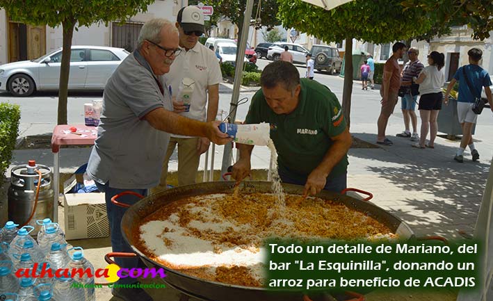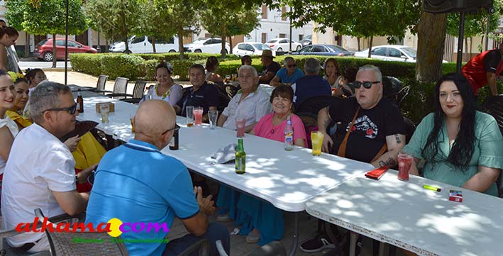 Mariano, del bar la Esquinilla, en la Plaza Alfonso XII, o Plaza del Rey, como se conoce en Alhama, sacrificó muy buena parte de este día de feria para dedicárselo a sus vecinos (están en la misma plaza) del Centro Ocupacional, donando y realizando generosamente tanto un arroz, para algo más de cuatrocientas personas, como el espacio de su terraza. El arroz costaba dos euros, que eran íntegros para la asociación, y fuimos testigos de que muchas personas se tuvieron que ir porque se acabaron los tickes del arroz y el espacio de la plaza, sobre todo las sombras, en un día en que, como es normal en junio, apretaba el calor.