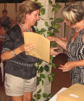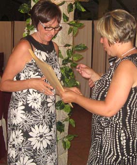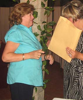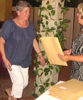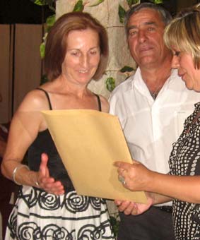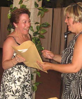 Emocionantes fueron también las palabras de una de las organizadoras, Juani Serrato, que tras la ilusión puesta en el encuentro durante su preparación ha perdido a sus dos seres más queridos, hace pocos meses a su madre Angustias y hace tan solo unos días a su padre Paco Serrato, lo que por un momento le produjo la duda de su asistencia. Precisamente Juani fue la encargada de hacer la entrega de un recuerdo que se había preparado de ese día, que consistían en un pin con el escudo de Alhama, un libro con la historia del escudo y la bandera local, la historia de la convocatoria y un diploma personalizado para recuerdo de este evento.