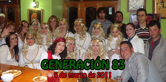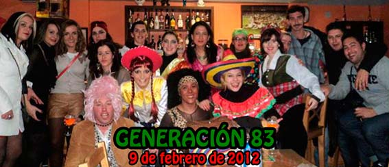 Siempre disfrazados, salvo en el año 2010, que se celebró en enero y vimos que no eso no iba con nosotros, esta generación ha celebrado sus encuentros caracterizados de personajes de lo más diverso, diosas griegas, personajes de cuentos, ciudadanos del mundo, etc. y este año para no ser menos también nos disfrazaremos, si queréis saber de qué, tendréis que buscarnos en los bares.
