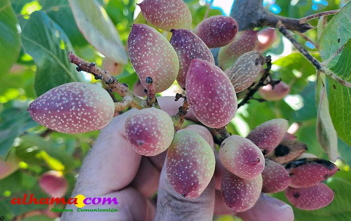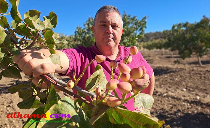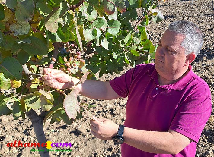 Hace siete años que el agricultor José Jiménez Valladares apostó por sembrar de pistacho once hectáreas de su finca de Alhama de Granada donde tenía tierra calma y cereal. Fue uno de los pioneros en introducir en su municipio un cultivo que le está dando alegrías y rentabilidad. Además de agricultor profesional, Jiménez Valladares es técnico agrícola con más de 25 años de experiencia y siempre le gusta ir por delante en su sector por lo que hizo sus cursos de formación en el IFAPA y se especializó en pistacho compartiendo experiencias con agricultores de La Mancha «que nos llevan 25 años de ventaja en este cultivo». «Me lo he trabajado mucho», admite. «Es un cultivo que me llama la atención y quería tener alternativas, para no cargar todo olivar y almendro. Tenemos el factor limitante del agua, ahora mismo ya tengo las aceitunas estresadas y el pistacho en cambio soporta bien la sequía».