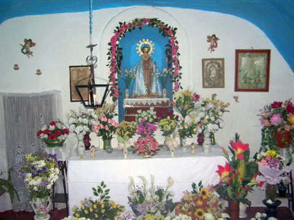 02/08/2007.- La ermita de los Ángeles tiene para los alhameños un encanto especial. Su localización en un espacio difícil de describir con palabras. Una leyenda, la del Salto del Caballo, que todavía produce asombro a la mayoría de las personas que incrédulas observan sobre la roca las marcas de las herrduras. Han pasado muchos años pero todavía parece que lo estoy viendo. Me refiero al profundo respeto de los agricultores que a lomos de sus mulos se dirigián a sus viñas y cuando pasaban por delante se descubrían la cabeza para acto seguido proceder a persignarse, cuando no desmontaban para dedicarle unas plegarias por entre la ventanitas divididas en cuatro por un enrejado en forma de cruz. Debido a algunos actos vandálicos esta puerta de madera fue sustituida hace unos años por otra metálica, al tiempo que se restauró el letrero de la fahada que hasta entonces era prácticamente ilegible y en el que ahora se puede ver el siguiente texto. "AÑO 1500 - NO PASES ALMA MIA SIN SALUDAR A MARÍA. NUESTRA SEÑORA DE LOS ÁNGELES. RESTAURADA EN 1888". También las de muchas personas que transitaban a pie por el más bello de los caminos que se paraban para echar unas pesetas por una rendija abierta en la puerta ex profeso y así ayudar a su mantenimiento que en los últimos aos lleva a cabo la familia de Teresa La Poncha.