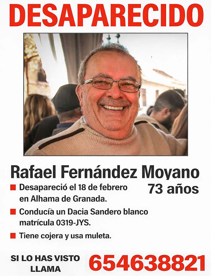 A todos nos ha sorprendido la noticia de la alerta sobre el desconocimiento del paradero de Rafael Fernández Moyano (73 años), que ha difundido la familia, ya que desde que, en la tarde-noche del miércoles 18 de febrero se le perdiera la pista. Bien es cierto que se algunos vecinos y establecimientos han reportado que lo vieron en esa tarde, pero la pista se pierde totalmente cuando a las 21:40, una de las cámara de seguridad vial, detecta la salida de su vehículo de la población, un Dacia Sendero de color blanco, matrícula 0319-JYS, por la carretera de Granada.