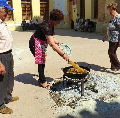 A las 9 de la mañana llegaban las personas más madrugadoras del hogar del pensionista y de la escuela de adultos que empezaron a sacar todos los preparativos: mesas, vino, el pan para las migas, encendieron las lumbres, pero hasta las diez no llegó el equipo de Canal Sur.