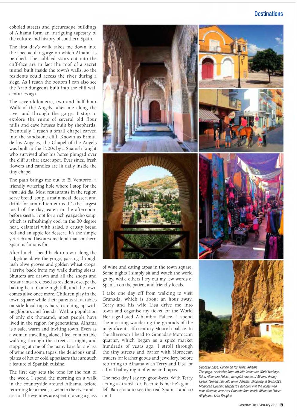 No tendría nada de particular un reportaje sobre Alhama en la prensa internacional, de hecho, y afortunadamente, aparece alguno de vez en cuando. Sin embargo, lo que nos ha llamado la atención particularmente de este es que el magazine RACT Jurneys es australiano, y más concretamente de Tasmania, aún más al sur de este continente. Sin embargo hasta allí ha llegado nuestro entorno y paisajes, así como parte del relato de una pequeña parte de nuestra historia, y la acogida de la periodista. Kara Douglas, por parte de uno de nuestros establecimientos más internacionalmente publicitados en estos reportajes, como es la Seguiriya donde se alojó Kara, y precisamente así comienza su relato: “Paco (Moyano) me saluda en la puerta de la casa de huéspedes de su familia con un beso en la mano… me toma del brazo… con una paternal palmadita y me muestra mi habitación…”