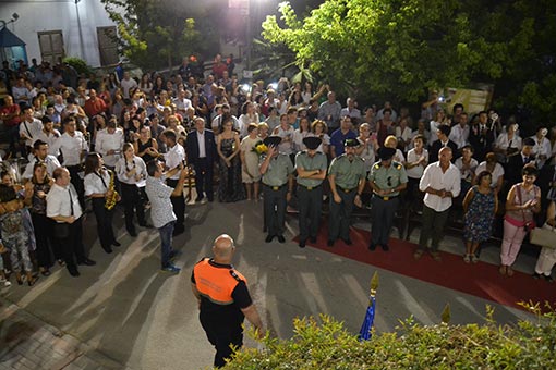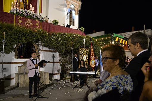 Le seguiría «un respiro musical» en la voz de María Teresa Gardón que ofreció una reinterpretación del tema dedicado a la Esperanza Macarena, pero en este caso adaptada a la Patrona de Arenas, a la que seguiría el acto de entrega del bastón de mando por parte de la alcaldesa socialista, Francisca García. Previamente dirigió unas palabras al numeroso público congregado para agradecer la colaboración de los vecinos y vecinas de Arenas del Rey y, en especial, del párroco «sin el cual no hubiese sido posible». Así mismo, explicó que la propuesta se llevó a pleno el pasado 24 de julio, y que fue aprobada por «por unanimidad, sin discusión ninguna». Seguidamente se procedió a la entrega del bastón, bajo una lluvia de pétalos, repique de campanas y vítores.