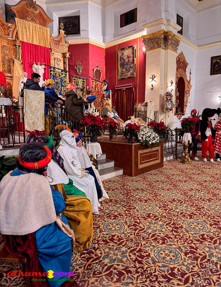 Una vez que la comitiva real llegó a la puerta principal de la iglesia, fue recibida por el párroco. La comitiva entró al templo siguiendo el protocolo establecido, saludaron al niño Jesús. En el interior de la iglesia se realizó el reparto de regalos y la entrega de más golosinas, junto con globos a cada niño, gestionados por el Ayuntamiento.