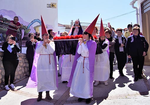 A las 12:30 h. comenzaba este particular Viacrucis por las calles del pueblo con un gran interés de todos los vecinos, los cuales iban asomándose y uniéndose al paso del cortejo. Este acto se realizó con una gran afluencia de gente y con un sol radiante, pudiendo demostrar sus dotes costaleras y penitentes los alumnos que integraban el acto.