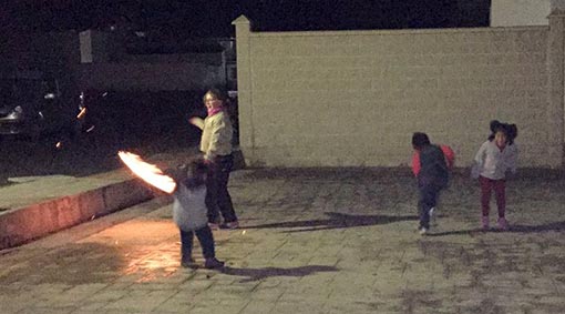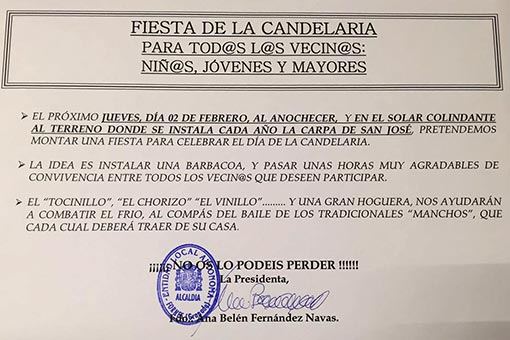 Después de varios amagos, ocasionados por la lluvia intermitente, pasadas la siete de la tarde, se prendió la Candelaria, con leña y ramas de pinos. Entorno al calor de la lumbre, los forneños asistentes disfrutaron de una agradable, y algo fría tarde, recreando antiguos y típicos bailes y coplillas, y degustando sabrosos majares, como tocino o chorizo asados a las ascuas de la hoguera.