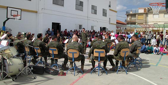El pasado miércoles, día 26 de abril, los alumnos del CEIP Virgen del Rosario de Jayena fueron visitados por miembros de la banda de música (también denominado Banda de Guerra), de una compañía de la Legión del acuartelamiento en Base Álvarez de Sotomayor en Viator (Almería). La visita se produjo a las doce del mediodía. Los militares de la banda de música, además de realizar juegos didácticos con los instrumentos, con los que los niños pasaron unos momentos muy divertidos, interpretaron diversas piezas musicales, que atentamente y de manera muy amena escucharon, alumnos, profesorado, padres y vecinos que se acercaron, pues el evento era de puertas abiertas. Tuvo lugar el encuentro en el patio del colegio.