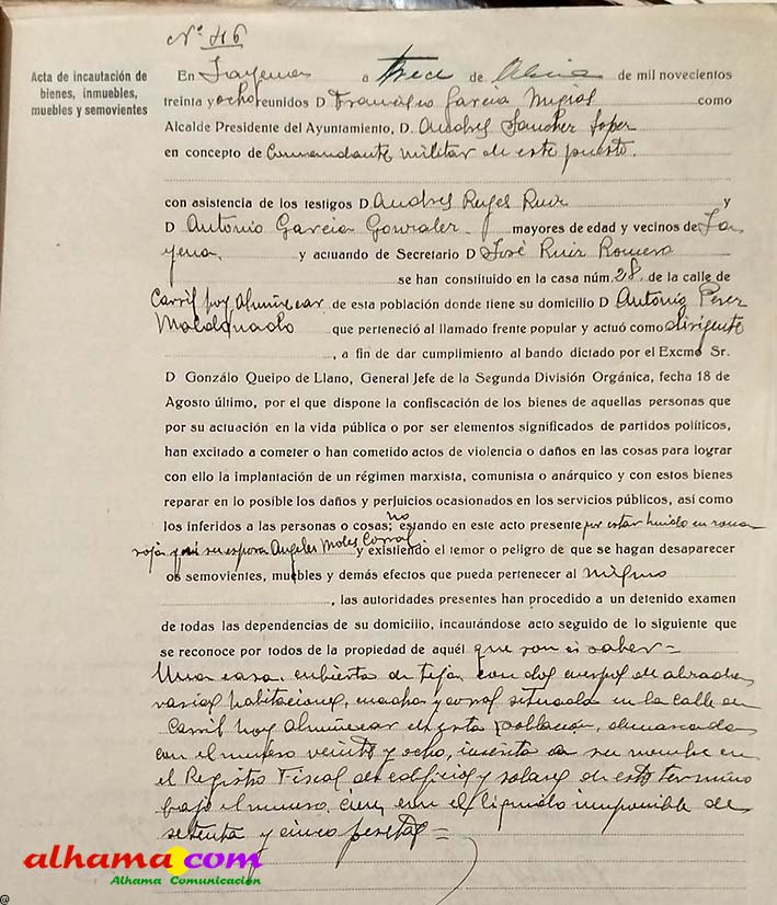 Era el 13 de abril de 1938 cuando se produjo la notificación. En dependencias municipales, y bajo la autoridad del alcalde, se le comunicó oficialmente la incautación de todos sus bienes inmuebles. El motivo alegado no dejaba lugar a dudas: ser esposa de quien había sido considerado dirigente del frente popular. Se encuentran presentes en esa trágica comunicación el mencionado alcalde y el comandante de puesto de la guardia civil de jayena (A.S.L.), con la presencia de dos testigos A.R.R. y A.G.G.; actuando de secretario J.R.R.