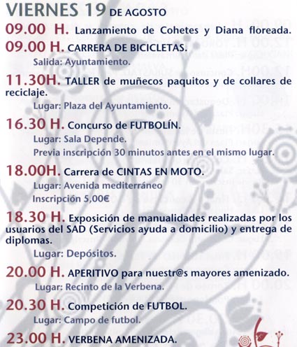 | Nota de la redacción: Alhama Comunicación tiene por norma no publicitar, promover o publicar actos concernientes a elecciones de reinas, misses, mister, etc., al entender que esto, promovido desde los poderes públicos, atenta contra la dignidad de las personas. Así como no mezclar cuestiones religiosas, de cualquier credo, desde las instituciones de un Estado Laico que en ningún caso debe inmiscuirse en ellas, por lo que de haber actividades en cualquiera de estos sentidos tendrán que ser consultadas a los organizadores correspondientes. (Línea editorial) | ||