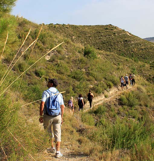 La visita partió del centro de información de La Resinera donde fuimos recibidos por los agentes Vicente y Daniel, nuestros guías durante toda la jornada que comenzaba con el recorrido del sendero botánico-paisajístico del “Mirador de la Resinera”, habilitado y señalizado en 2005 por un grupo de voluntariado ambiental. Esta vereda sube al antiguo depósito de agua a través de una ladera cubierta por un pinar aclarado con matorral mediterráneo de espartos, salvia, romero y tomillos entre otras. La integración de la información en el entorno es total utilizando como material soporte una losa de piedra al pié de la planta como se ve en las fotografías. Arriba, el mirador ofrece una buena panorámica del entorno, incluyendo todas las instalaciones de La Resinera en el valle.