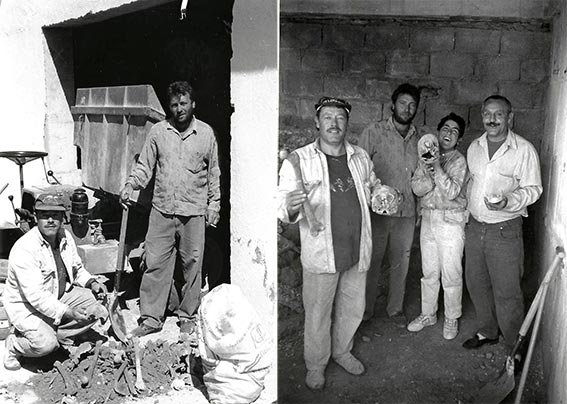 Trabajadores del PER realizando inhumaciones en el edificio del Hogar del Pensionista, lugar del antiguo cementerio de Jayena