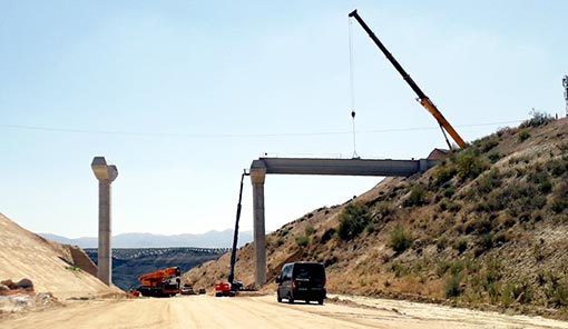 Las obras de la variante de Moraleda de Zafayona (Granada) afrontan estos días una de las operaciones más singulares, la colocación durante tres días de las 12 vigas que soportarán el tablero del puente de acceso a la urbanización de Los Tablazos, que salva a dicha variante de población, y que se concluye esta semana.