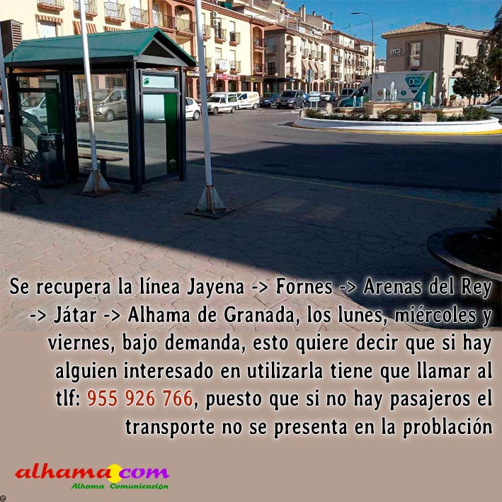 Entre ellas se encuentra la de Jayena -> Fornes -> Arenas del Rey -> Játar -> Alhama de Granada y viceversa, pero bajo demanda.