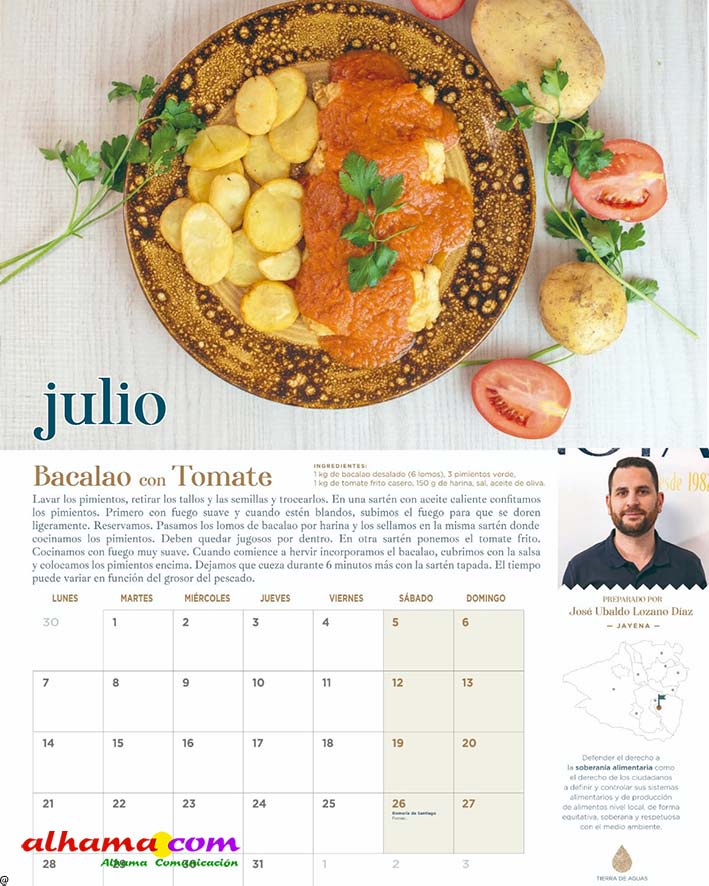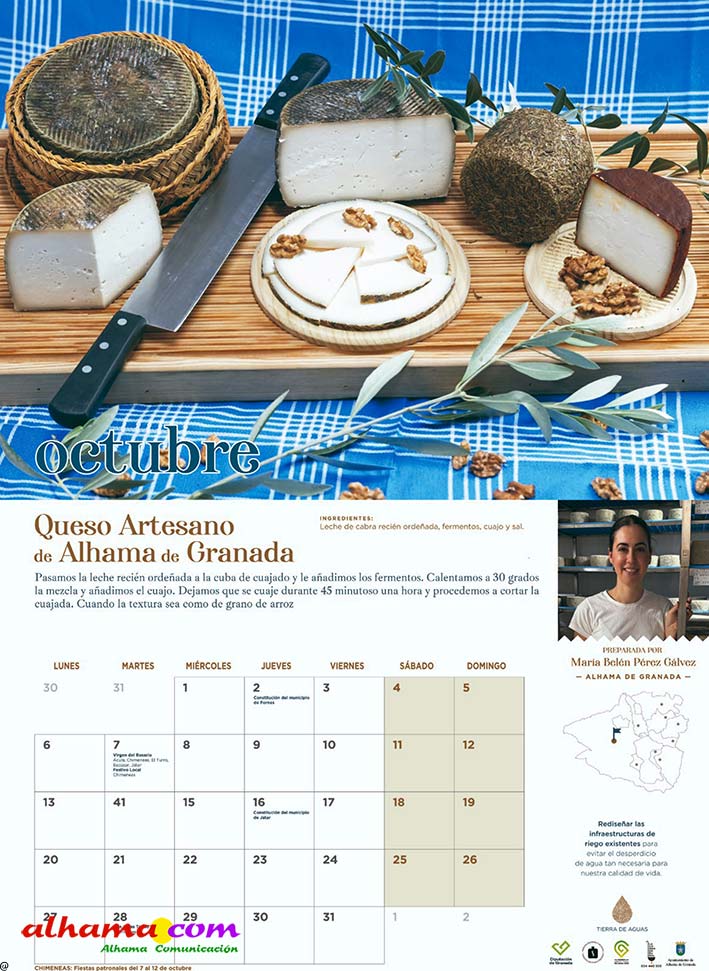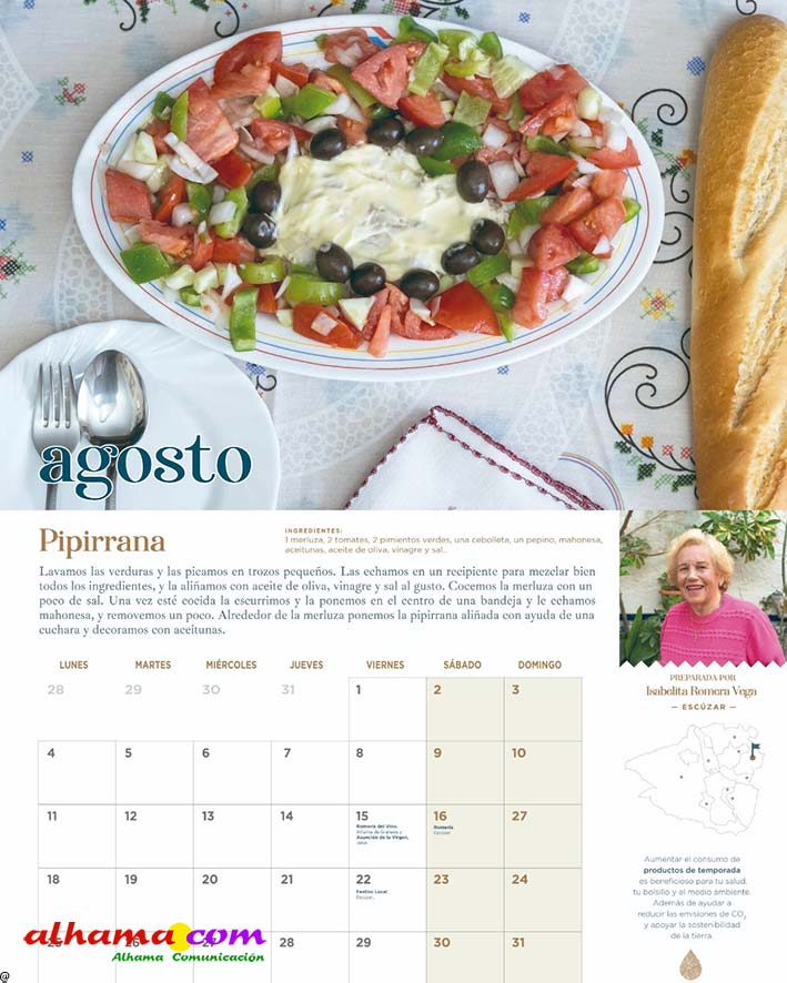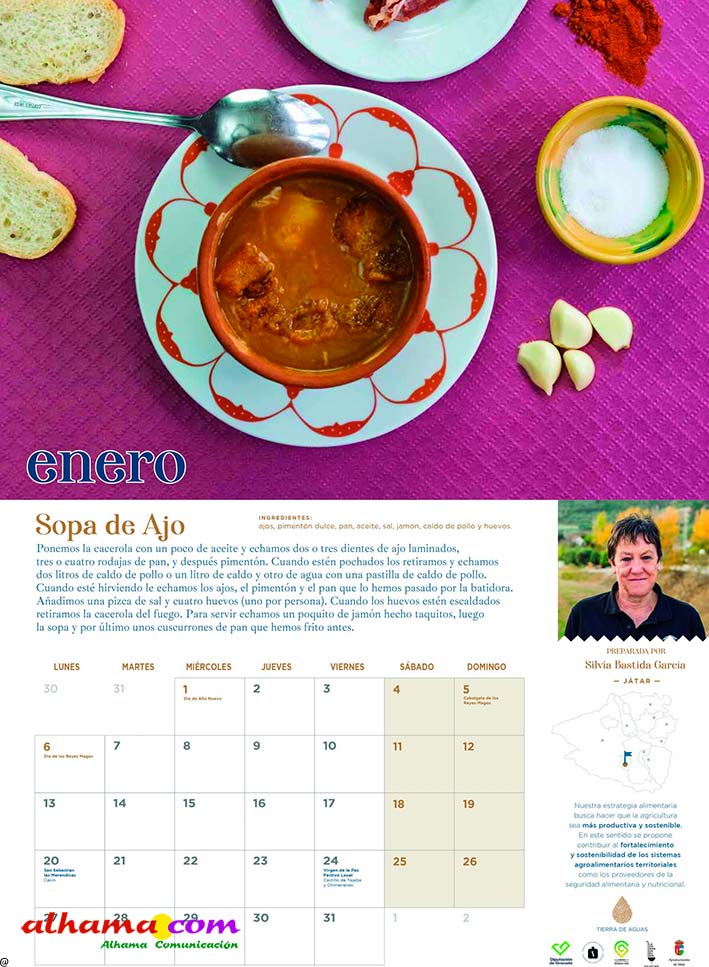 En 2023, la Asociación Tierras de Aguas que, en la actualidad aglutina ocho municipios de las comarcas de Alhama y El Temple: Agrón, Alhama, Chimeneas, Escúzar, Fornes, Játar, Jayena y Ventas de Huelma, puso en marcha la interesante iniciativa de publicar un calendario con recetas típicas de la zona, elaboradas con productos de la tierra por vecinos de ambas comarcas. Se procuraba que la receta estuviese en concordancia con la estación del año y de la que, una vecina, principalmente, y algún varón decidido, indicaban los ingredientes y proceso de elaboración. De esta forma se facilitaba la conservación de platos tradicionales como la sopa de maimones, las torrijas, el potaje de maimones, el potaje de morillas, la calabaza frita, los borrachuelos o las gachas de miel de caña. El año pasado se incluían otras doce recetas como la tarta de la abuela, el potaje de vigilia, la sopa de espárragos, los calostros, el ajo blanco, la mermelada de higos o el cocido de garbanzos, entre otros. En lo que va de 2025 las recetas incluidas en este práctico almanaque han sido la sopa de ajo, el guiso de col con chorizo, los roscos de vino, la empanada de pisto, la pipirrana, o el queso artesano de Alhama. Ya están buscando a las personas de ambas comarcas que quieran compartir alguna receta«con sabor a tradición» para el calendario 2026.
