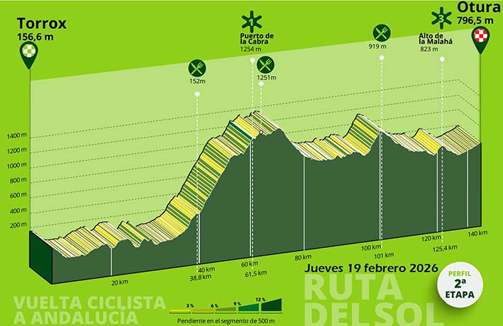 La Vuelta a Andalucía celebrará su 72ª edición con un recorrido diseñado para clasicómanos y corredores explosivos, sin grandes altitudes pero con terreno constante para la batalla. Del 18 al 22 de febrero, la ronda andaluza unirá costa e interior a lo largo de más de 810 kilómetros, cinco etapas y nueve puertos de montaña, mostrando la diversidad paisajística de cinco provincias. El arranque será en Benahavís, con final en Pizarra, en una jornada marcada por el Puerto del Madroño y el Puerto del Viento, mientras que la segunda etapa llevará al pelotón desde Torrox hasta Otura, con el exigente Puerto de la Cabra como principal dificultad, aunque alejado de meta.