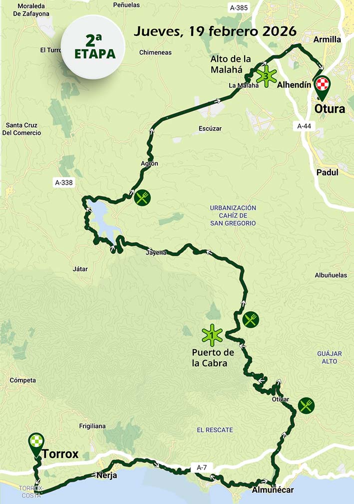 Jornada de gran contraste que comienza a nivel del mar y finaliza en el interior granadino. Tras los primeros kilómetros rápidos junto a la costa, el terreno cambia radicalmente con la larga ascensión al Puerto de la Cabra (1a categoría), uno de los grandes puertos de esta edición, que seleccionará de forma clara el grupo principal.