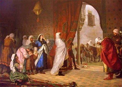 “Engolfado Abulhásan cada vez más en los placeres, seguía su alguacil en el desgobierno del reino, decretando nuevos pechos y haciendo objeto de su rapacidad los bienes del pueblo. Llegó a tener tan en menos á los hombres más esforzados y valerosos del ejército, que concluyó por suprimirles los sueldos, con lo que exhaustos de todo recurso, se vieron en el duro trance de apelar para comer á la venta de sus armas y caballos. Y como este proceder desatentado y loco había de dar por fuerza margen á murmuraciones y censuras, cortándolas de raíz, mandó matar el Emir á muchos varones de dirección y consejo y á los arráeces y caballeros más ilustres del reino. Forjabanse el Emir Abulhásan y su alguacil la ilusión de que, en guerra á la sazón los cristianos los unos con los otros, no había de llegar el día en que hubiesen menester del arrimo y ayuda de aquellos nobles cuanto infortunados caballeros, sacrificados en hora menguada á su recelo y temor. No hay que decir con esto la deplorable situación en que se encontraba el ejército y la penosísima del pueblo, esquilmado por las gabelas y tributos destinados á fomentar la crónica liviandad del sultán.