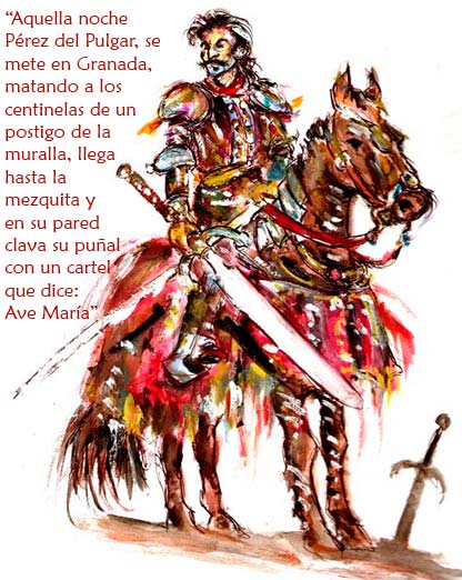 Uno de ellos fue Pulgar, el de las Hazañas,... Era entretenimiento favorito de este Pulgar, durante su encierro en Alhama, salir de noche con algunos compañeros, y emboscarse al amanecer en las encrucijadas y caminos, para sorprender a los moros, apoderarse de su convoyes y cautivar soldado de Boabdil en las puertas mismas de la capital; y un día, embriagado por la suerte, que fue eterna compañera de sus correrías, y por el celo guerrero y religioso que tan hondamente le embargaba, detúvose en lo más alto de un picacho, contemplando a Granada, cuyos fantásticos palacios aún no eran cristianos, y en cuyos alminares dábase todavía culto al Profeta, con ofensa del verdadero Dios. Arrobóse en una mezcla de misticismo y de furor guerrero, y juró sobre la cruz de su espada realizar por su cuenta lo que le habían prometido los Reyes, y dar al mundo un ejemplo que aterrara a los moros granadinos, y pusiera en lo más alto de la fama el nombre de los soldados castellanos y el prestigio de la cruz sobre el Islam.