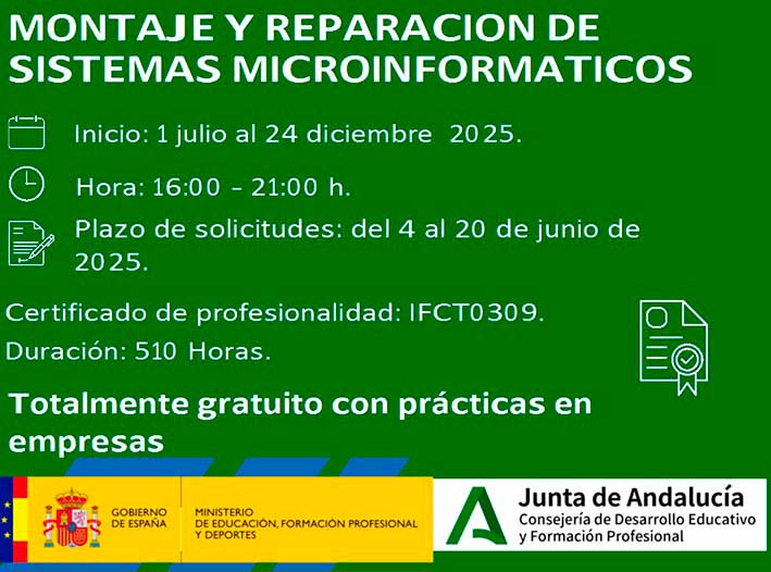 El IES Alhama pone en marcha, a partir del próximo 1 de julio, el Certificado de Profesionalidad de Montaje y Reparación de Sistemas Microinformáticos, una formación gratuita de 510 horas, dirigida a personas interesadas en especializarse en un sector con alta demanda laboral y gran proyección de futuro.