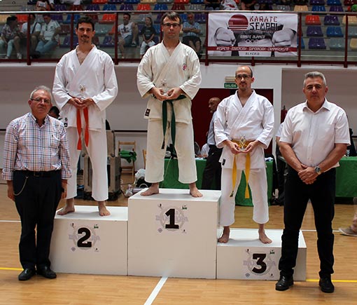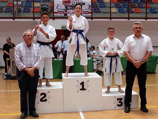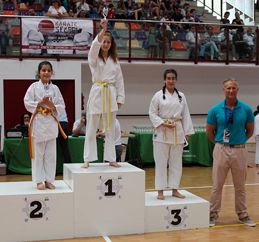 Los karatekas del club deportivo Alhama-Ippon pasean la bandera alhameña, donada por la concejalía de deportes, y la suben a lo más alto del pódium.