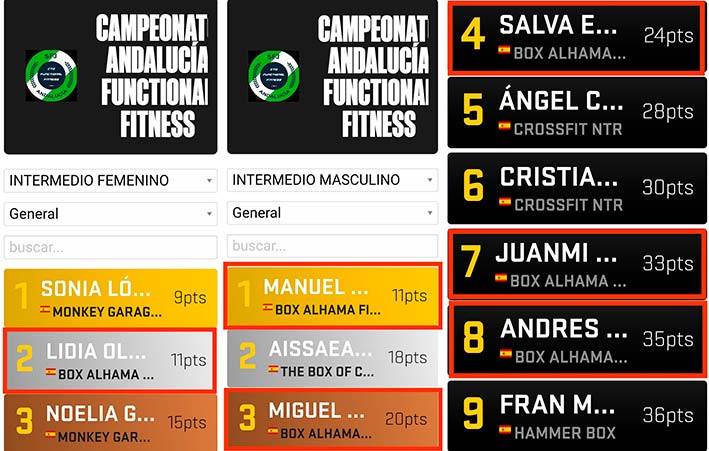 Campeonato regional de Funcional Fitness celebrado el pasado sábado 21 de marzo en las instalaciones del Factory box en Granada, nuestro centro Box Alhama Fitness ha participado por primera vez en este evento con seis atletas, de los cuales tres de ellos han conseguido clasificarse para el Campeonato Nacional que se celebrará en Madrid sobre el mes de julio, los otros tres han conseguido quedar entre los diez mejores puestos estando uno de ellos en un cuarto puesto y rozando pódium.