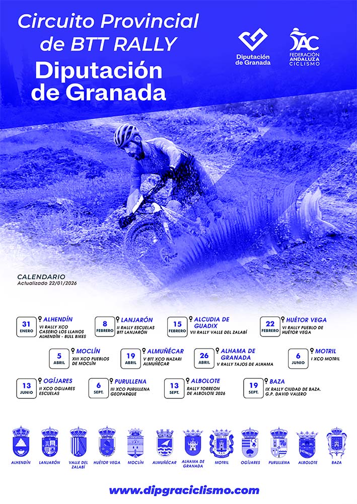 El diputado de Deportes e Instalaciones Deportivas, Eric Escobedo, junto al presidente de la Federación Andaluza de Ciclismo, Carlos Rueda, ha presentado el Circuito Provincial de BTT Rally 2026. El evento contará con pruebas en los municipios de Alhendín, Lanjarón, Alcudia de Guadix, Huétor Vega, Almuñécar, Alhama de Granada, Moclín, Motril, Ogíjares, Albolote, Baza y Purullena, y se celebrarán del 31 de enero al 19 de septiembre. Abarcando diferentes categorías de ciclistas, desde Promesas hasta Máster 60, tiene el objetivo de promover el deporte en la provincia y ofrecer un espacio para que los deportistas granadinos muestren su talento.
