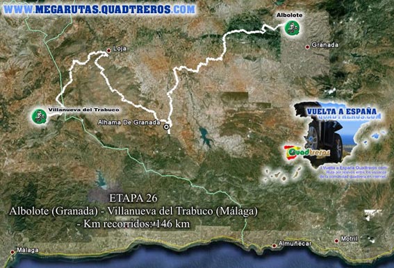 Despues de desayunar salimos rumbo a Alfarnate saltando Sierra Gorda, siguiendo luego el recorrido llegamos al nacimiento de agua de Guaro anejo de Periana. Continuamso camino hacia la provincia de Granada observando el mar como fondo y llegamos a Alhama de Granada para regoger el testigo de la Vuelta a España Quadtreros.com